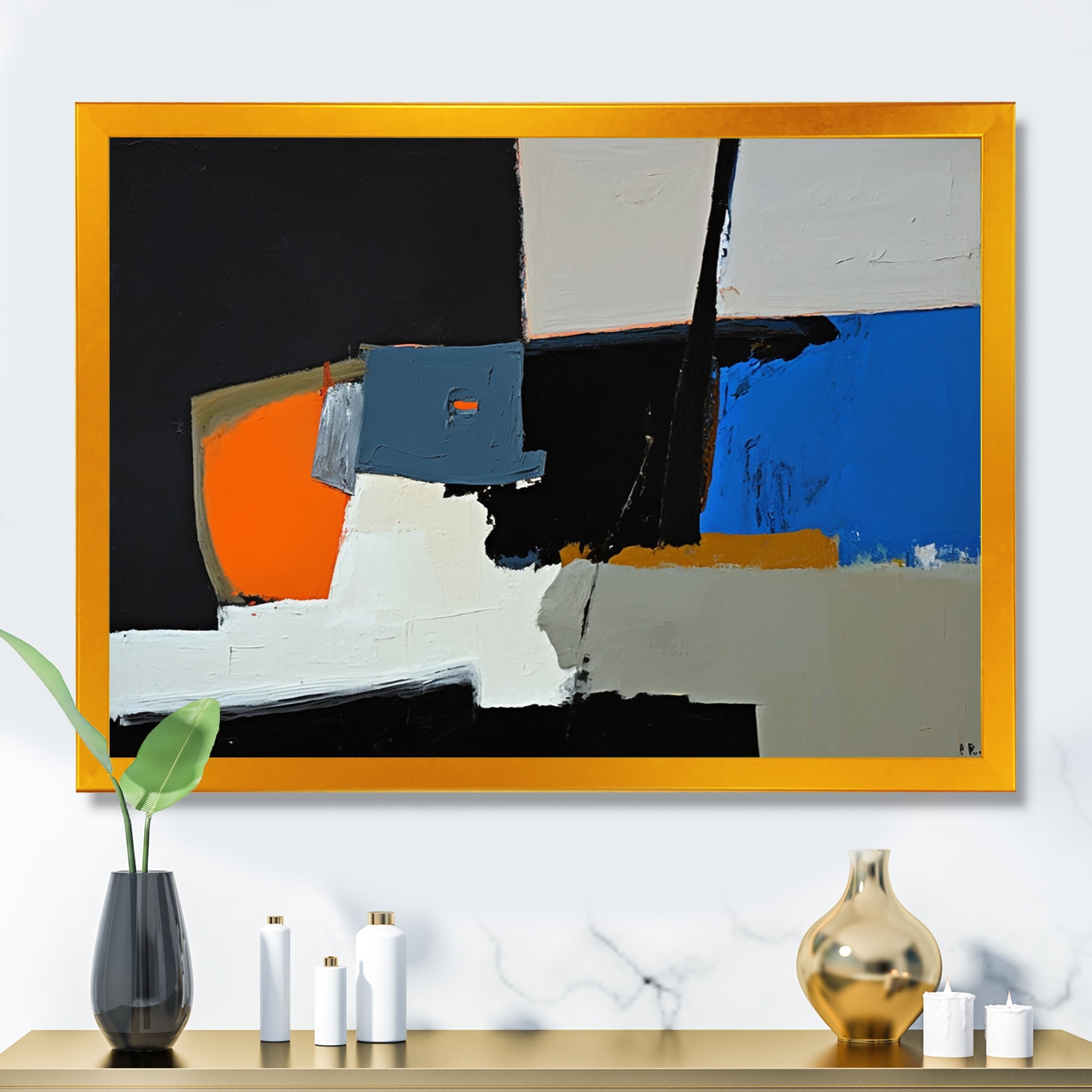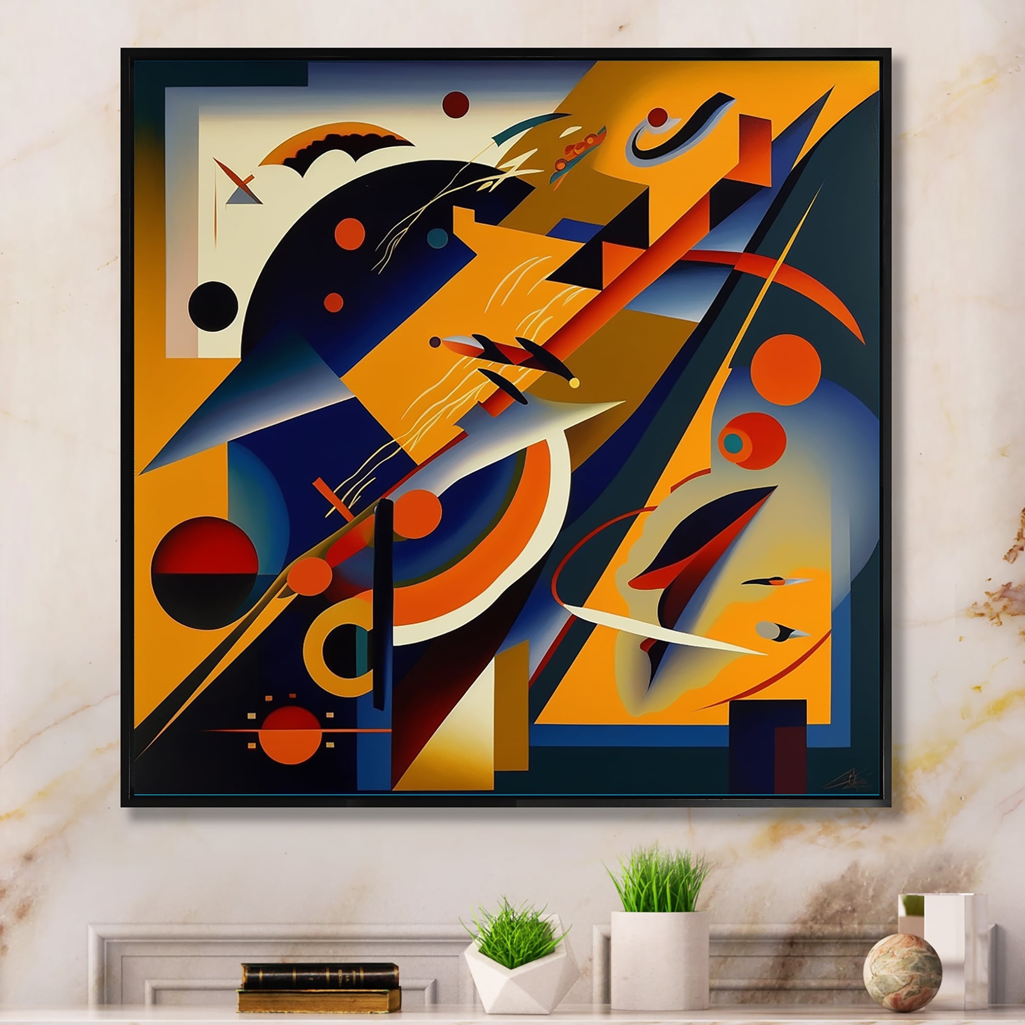 Designart "Geometrical Shapes in Orange And Blue" Modern Framed Canvas Wall Art Print