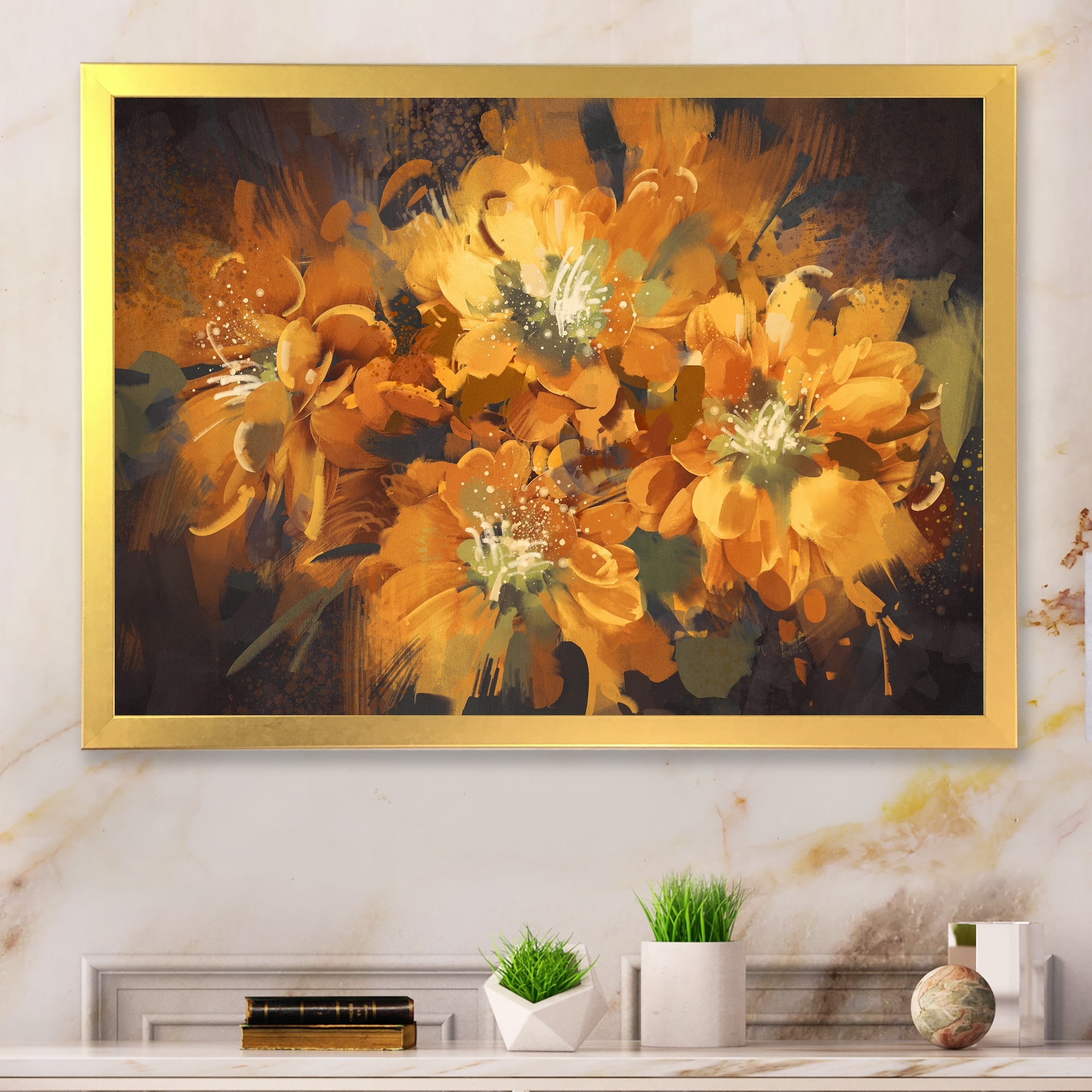 Designart "Orange Grunge Flowers" Modern Framed Art Print