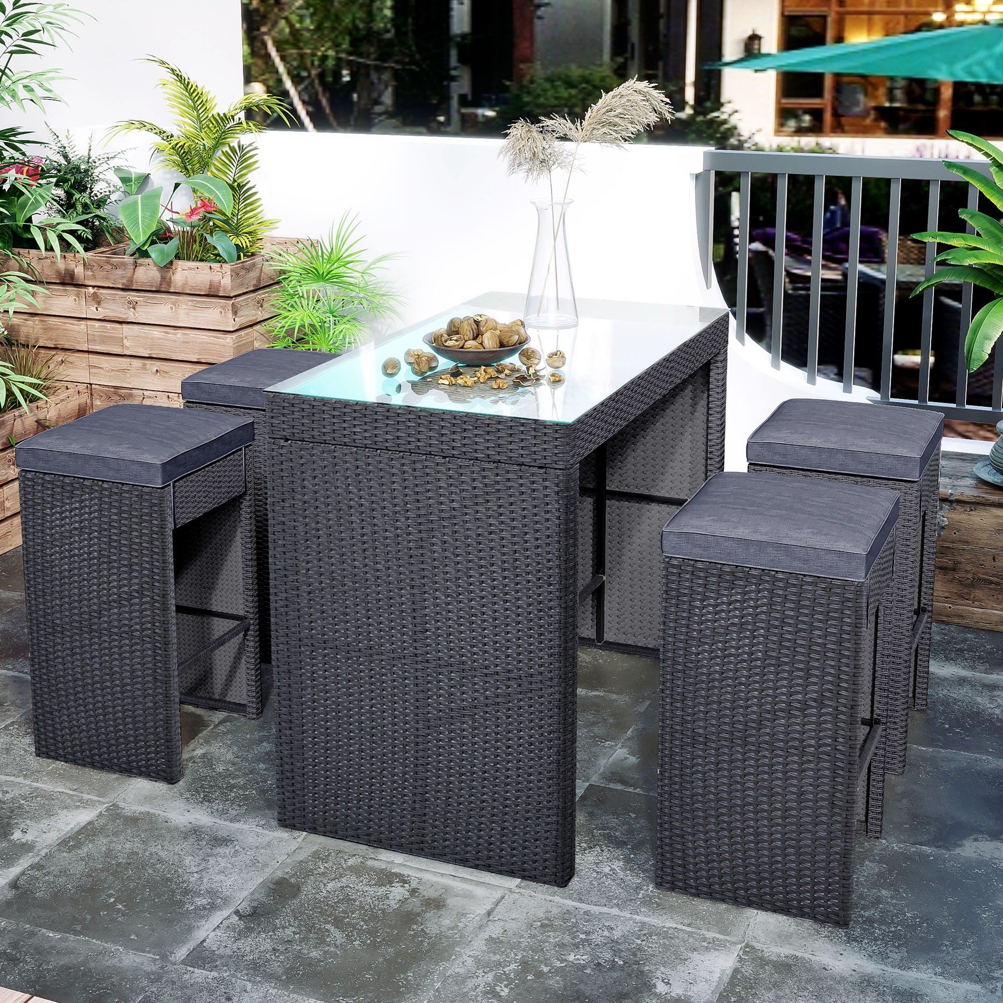 5-piece Rattan Outdoor Patio Furniture Bar Dining Table Set with 4 Stools and Cushion