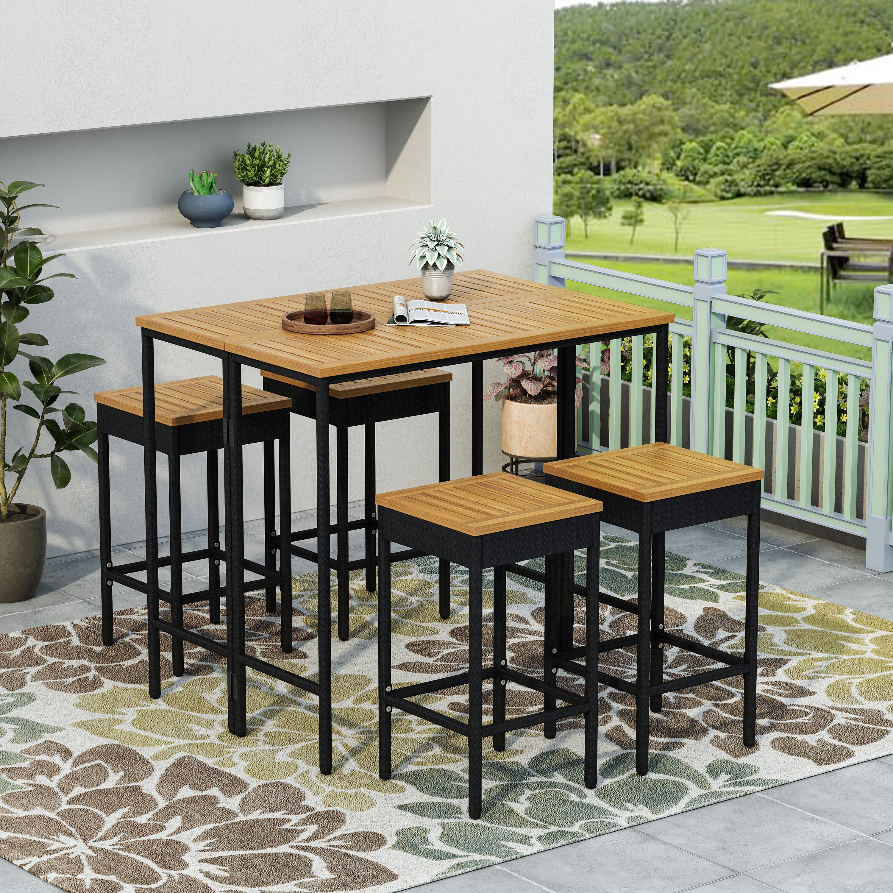 5-piece Rattan Outdoor Patio Furniture Set Bar Dining Table Set with 4 Stools