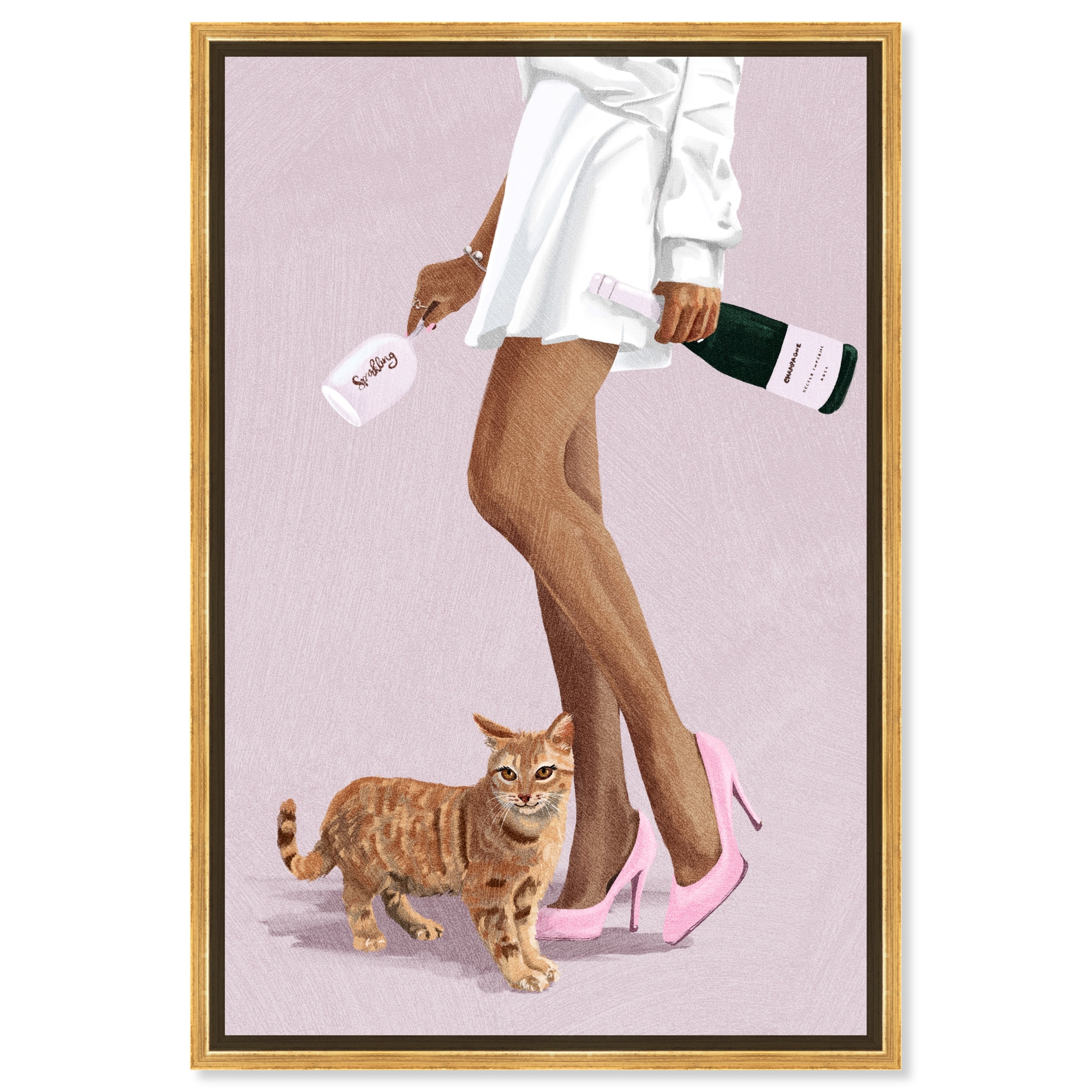 "Champagne and Pet", Champagne Woman and Cat Glam White Framed Canvas Wall Art Print for Dining Room