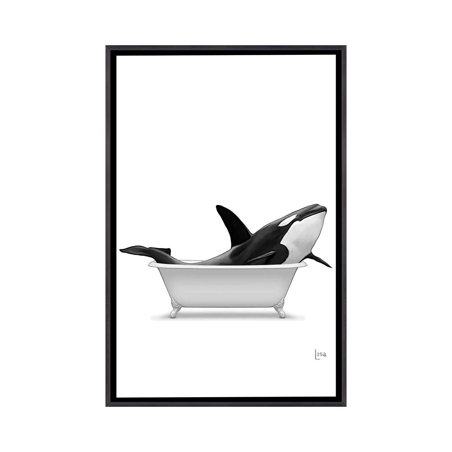 iCanvas "Whale In Bathtub Black And White" by Printable Lisa's Pets Framed