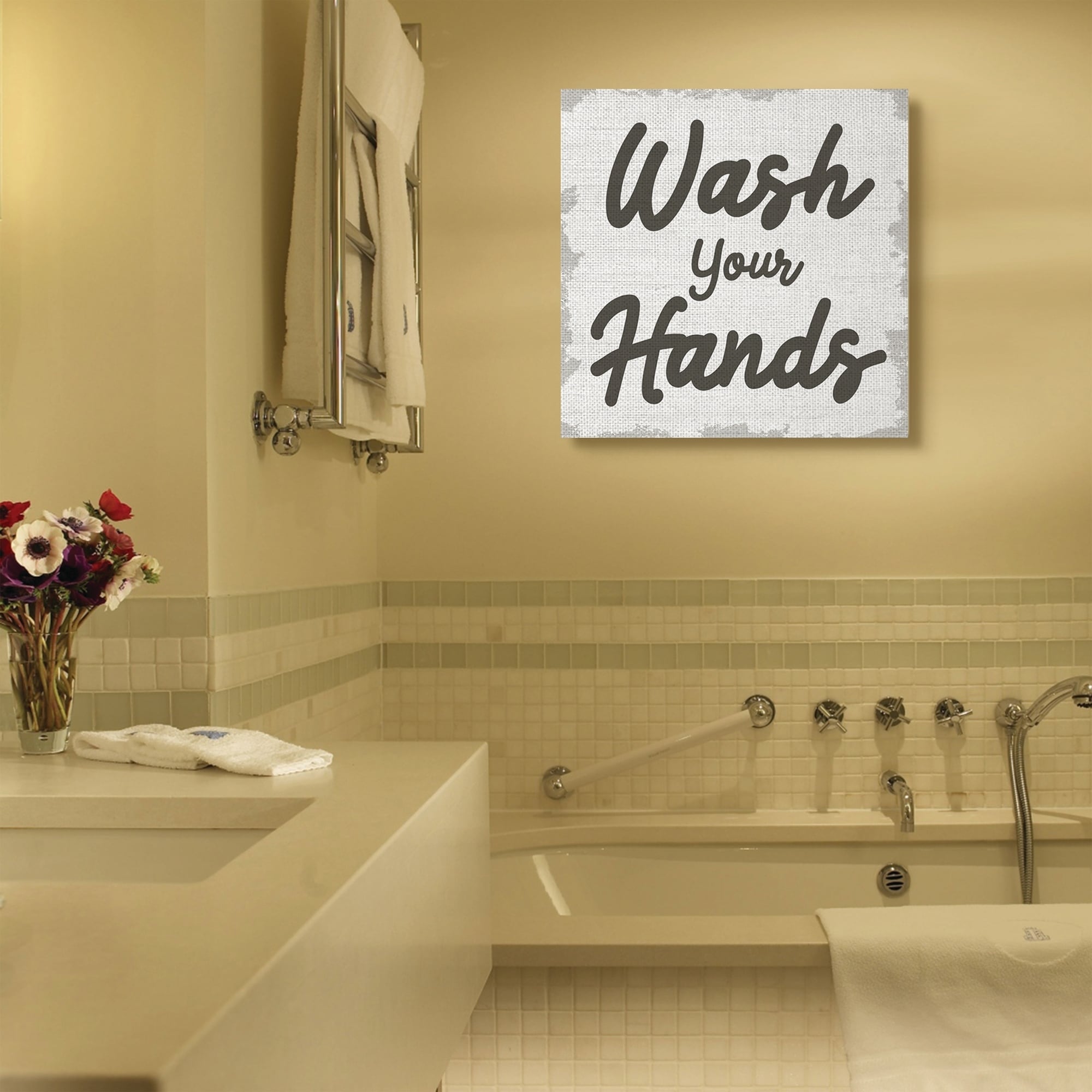 Stupell Industries Wash Your Hands Bathroom Neutral Grey Word Design Canvas Wall Art, Proudly Made in USA