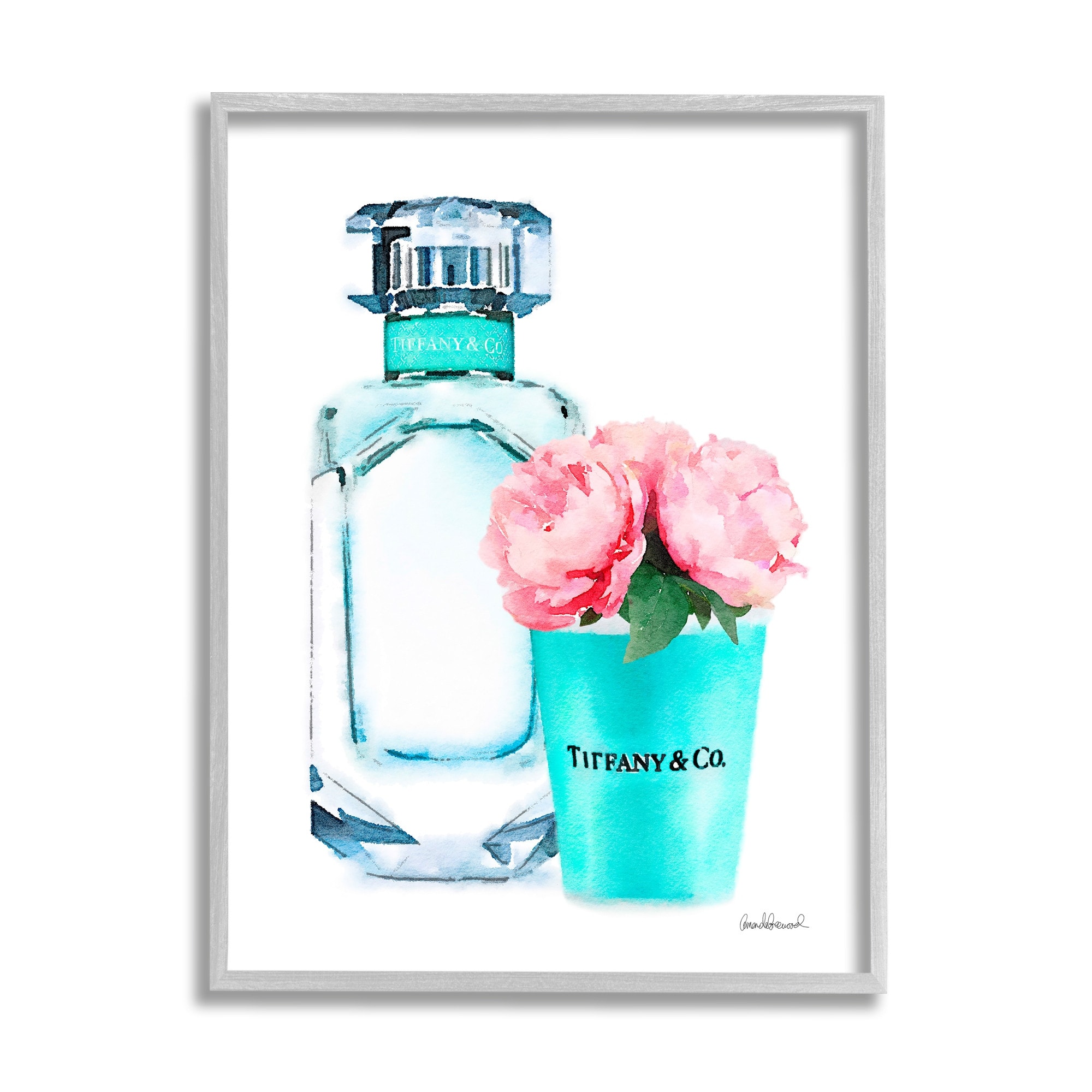 Stupell Industries Teal Blue Perfume Bottle and Pink Peonies Grey Framed, 11 x 14, Proudly Made in USA - 11 x 14