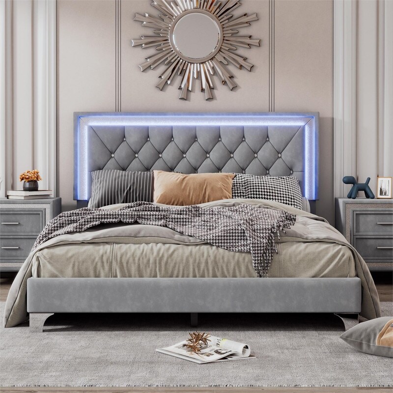 Queen Size Upholstered Bed with LED Lights,Velvet Platform Bed Frame