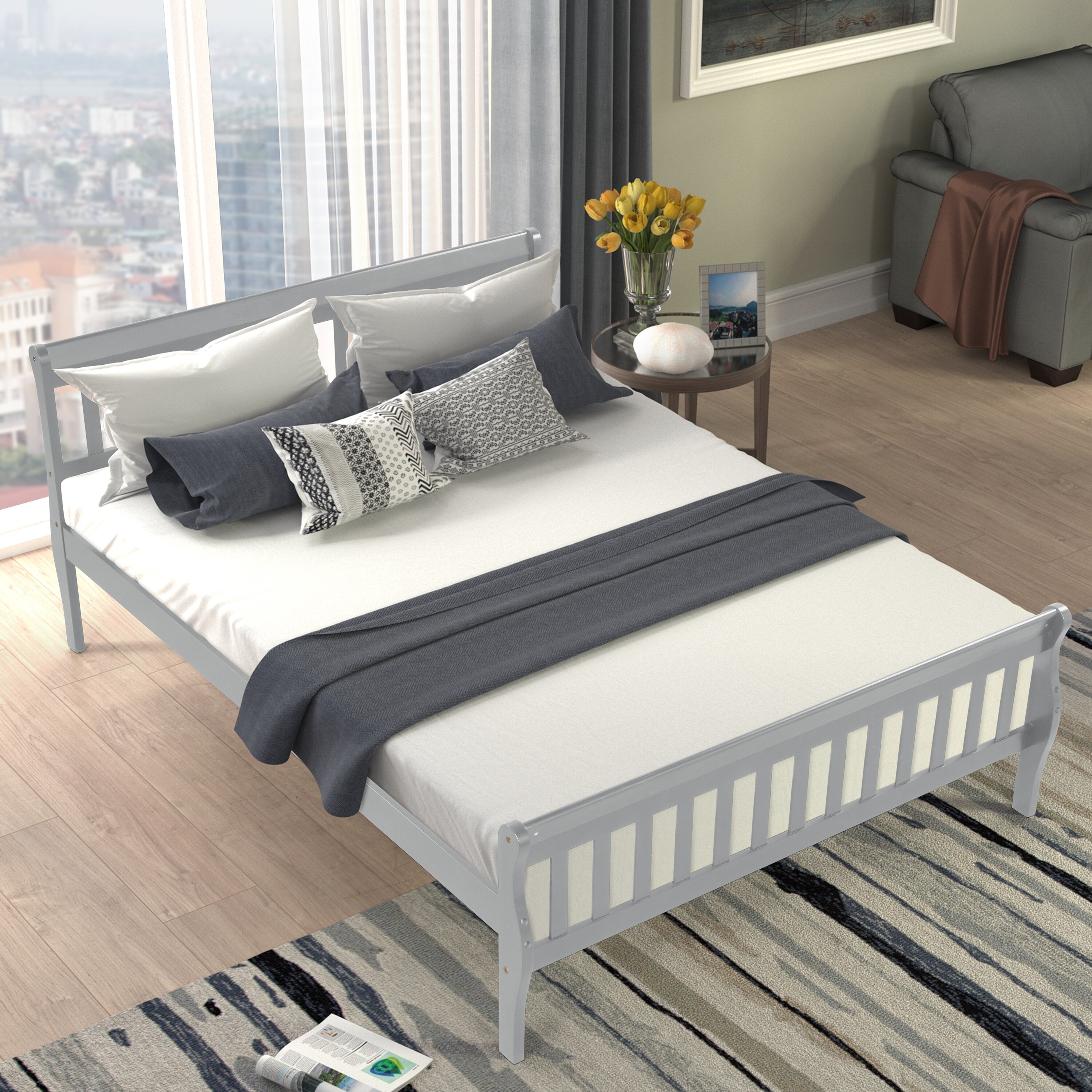 Queen Wood Platform Sleigh Bed Frame with Headboard for Guest Living Room