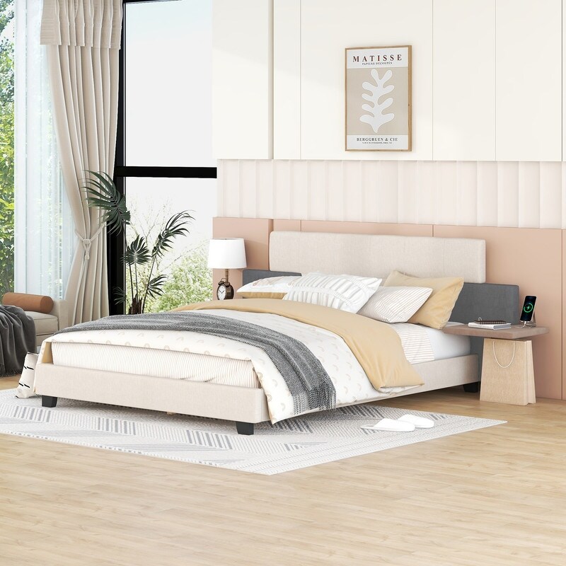 Queen Size Upholstered Platform Bed with Bedside Shelves and USB Charging Design, Beige+Gray