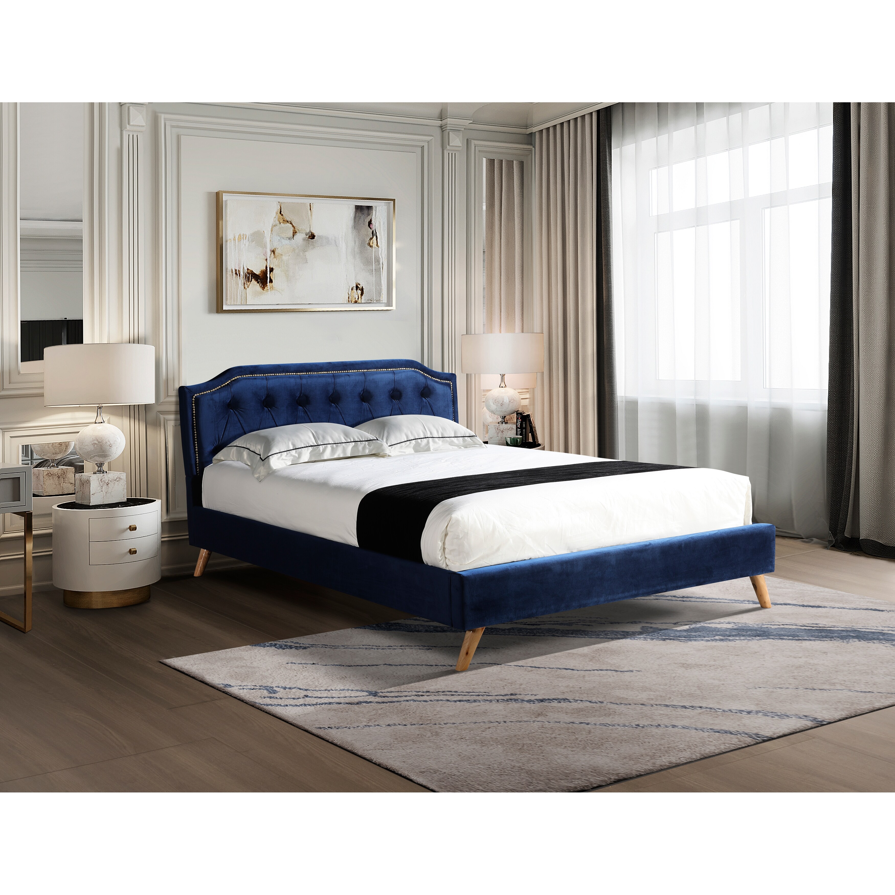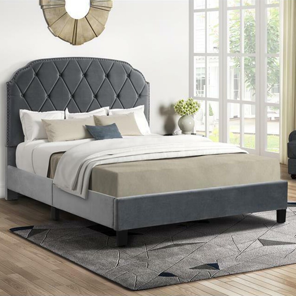 Queen Size Velvet Platform Bed with Nailhead Trim Gray