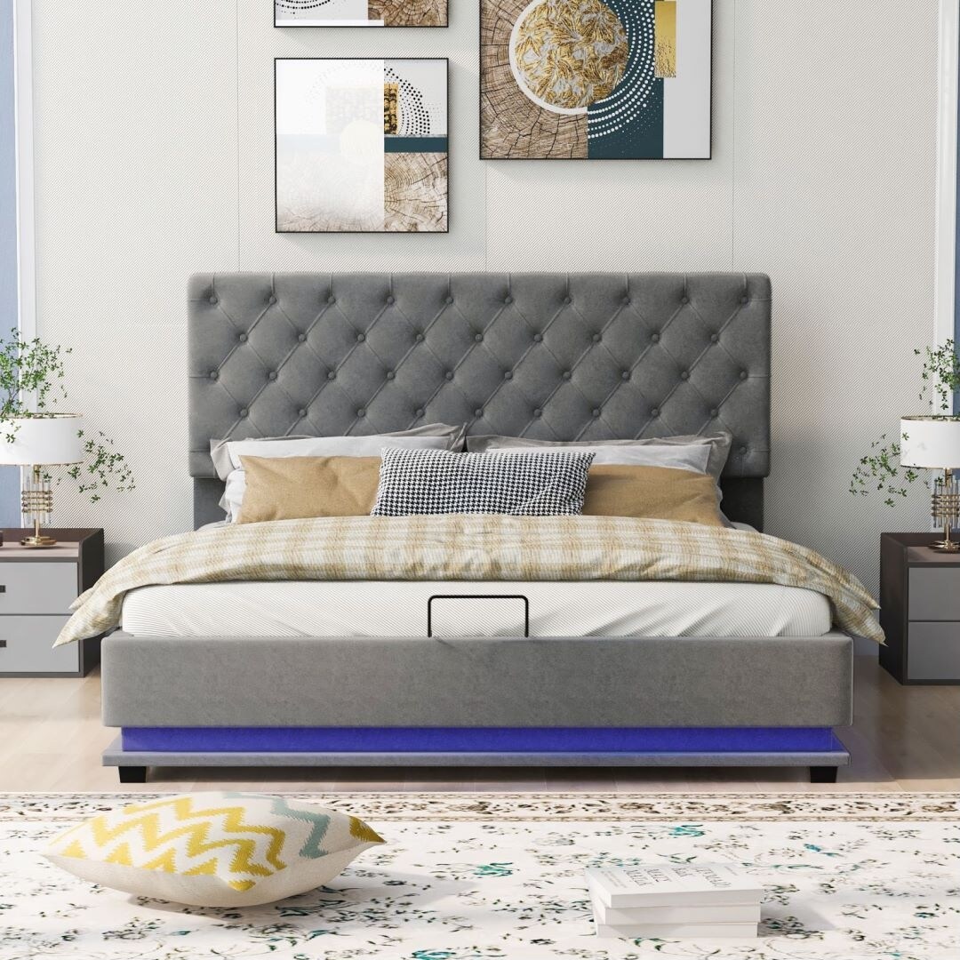 Grey Queen Size Storage Platform Bed with Headboard and LED Light