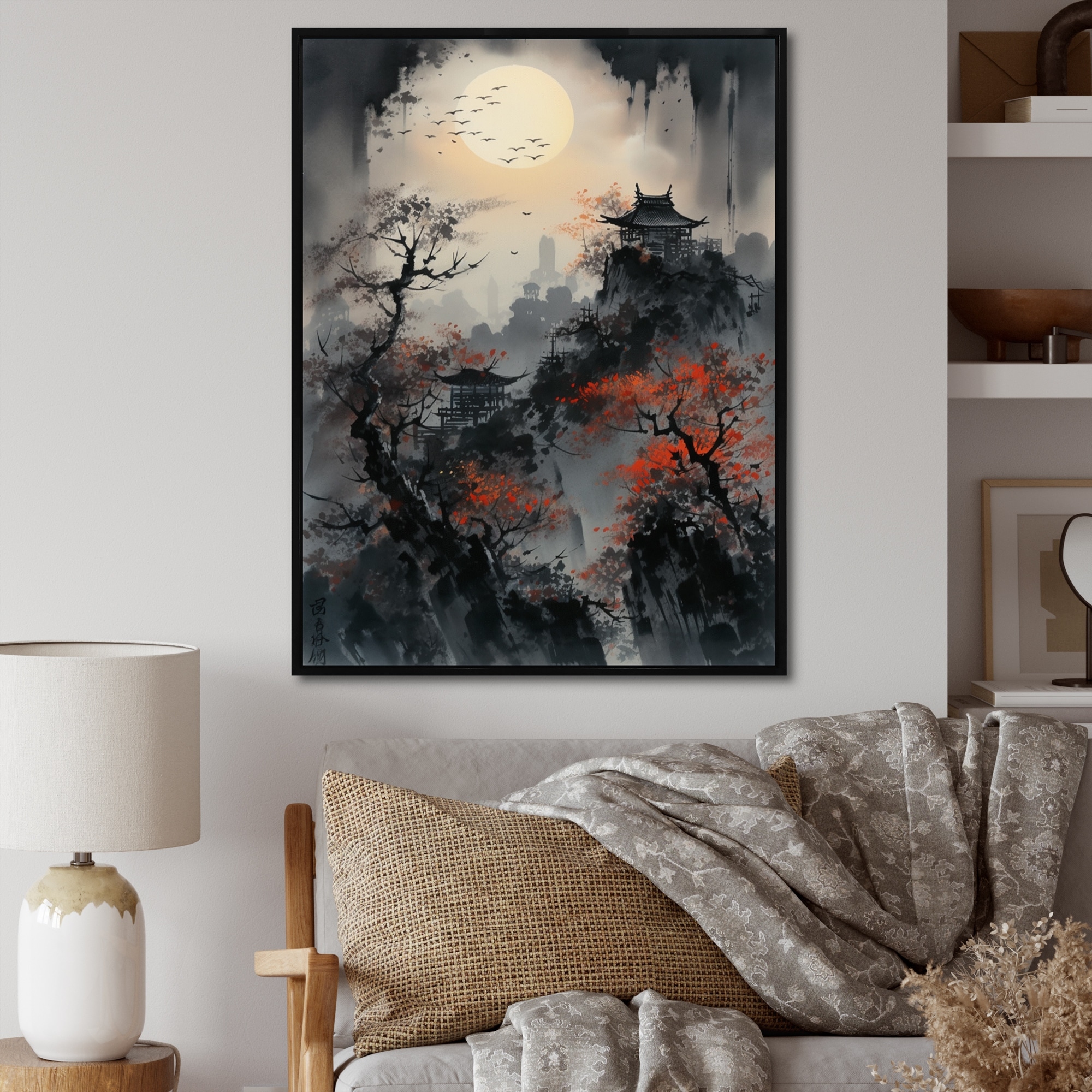 Designart "Red Moonset Raven Cry Japon Ii" Japon Landscape Framed Canvas Print