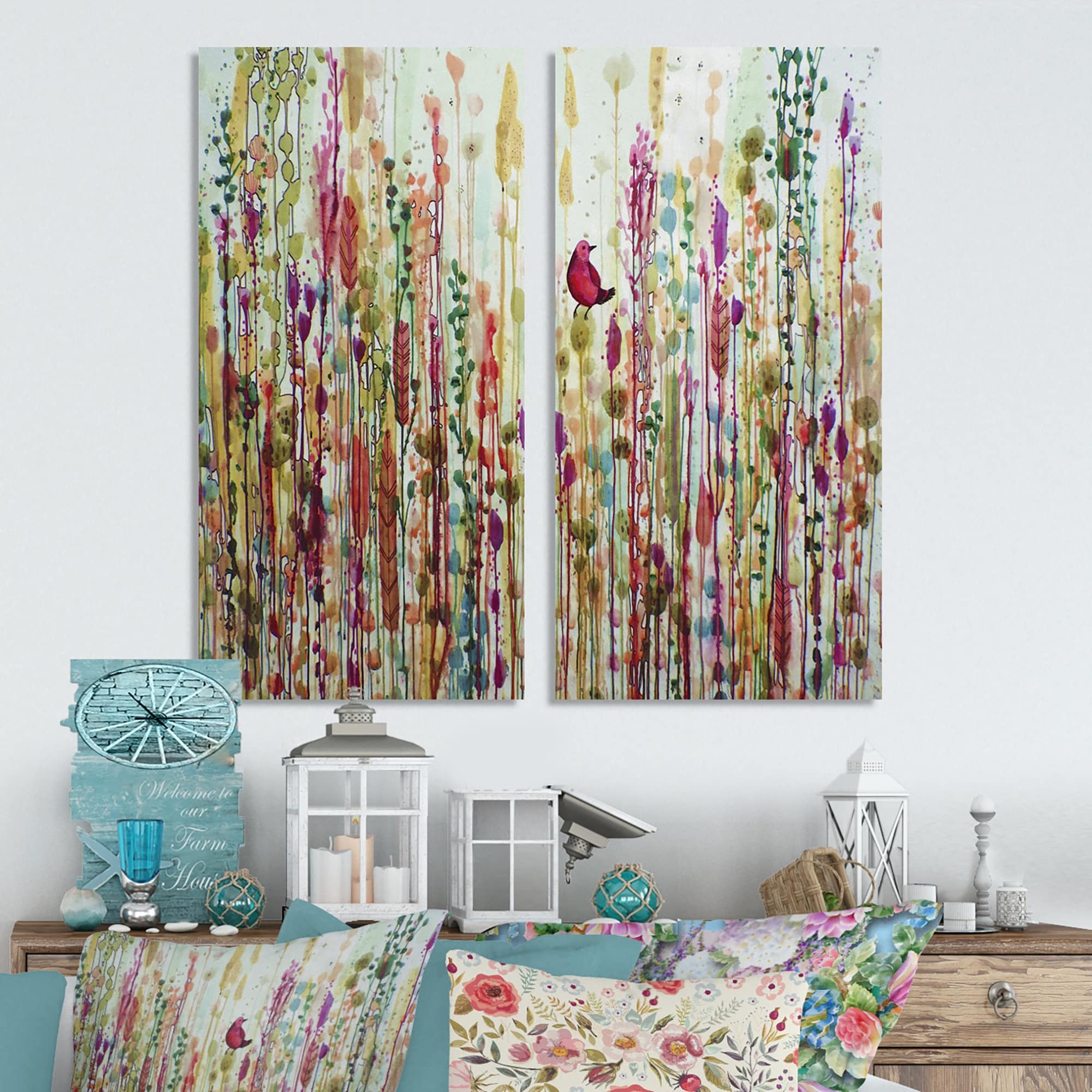 Designart "Red Bird in Color Meadow" Cottage Canvas Wall Art Print 2 Piece Set