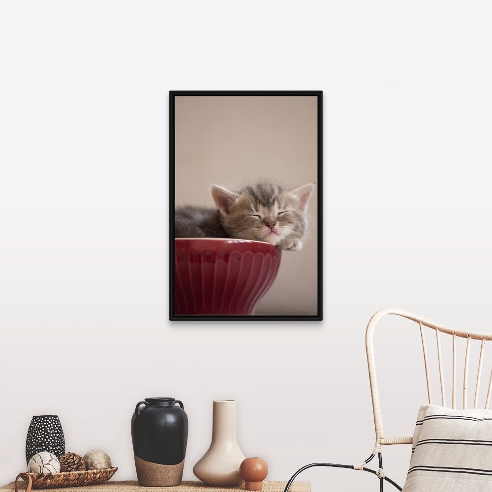 "Kitten Sleeping in Bowl" Black Float Frame Canvas Art