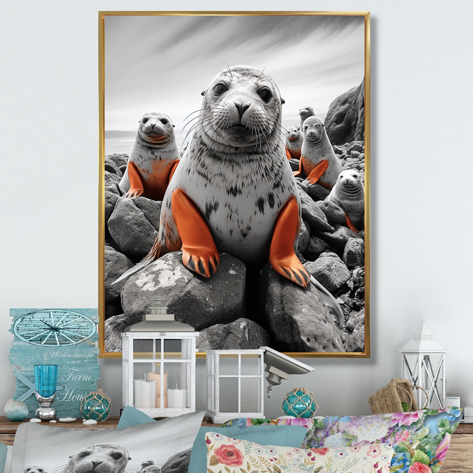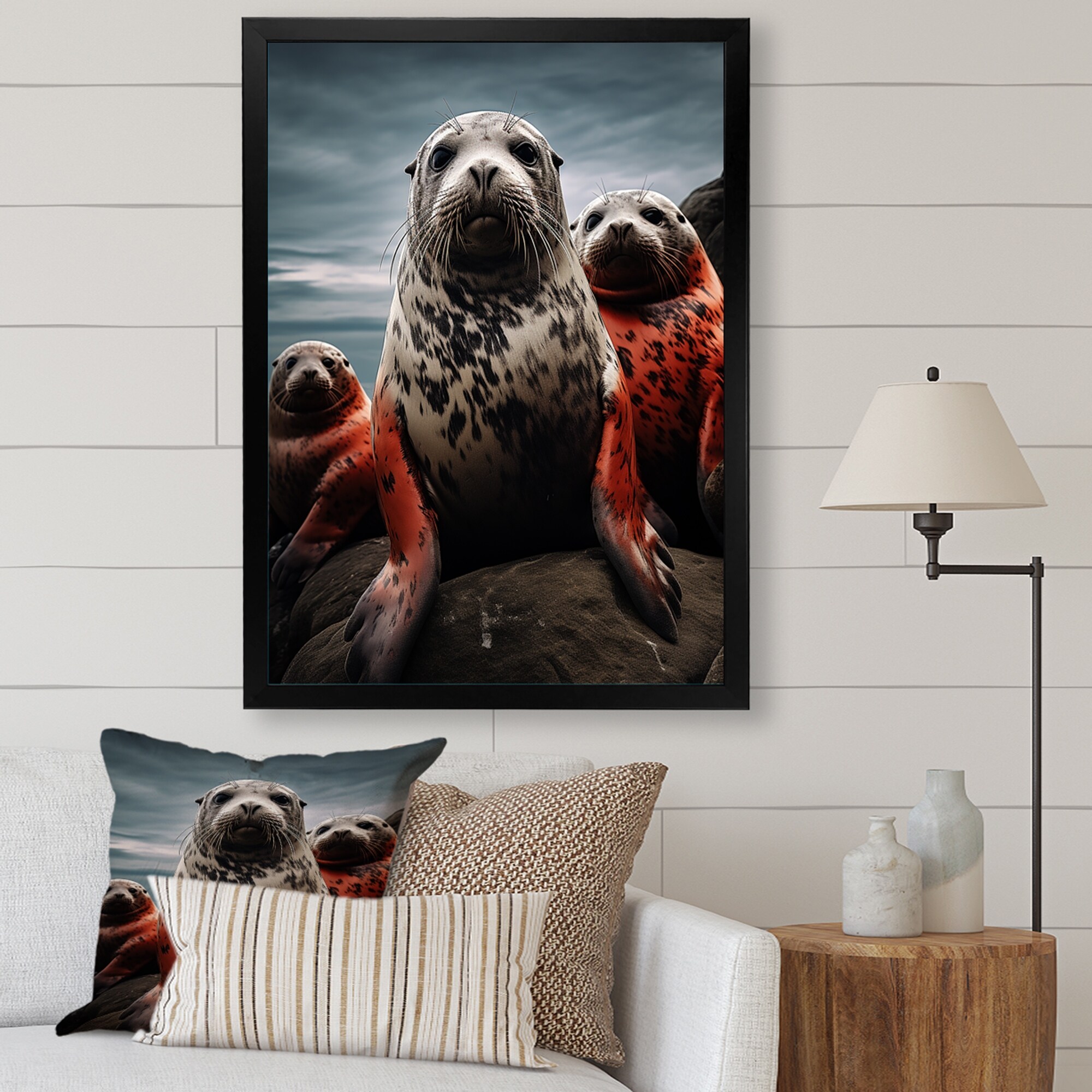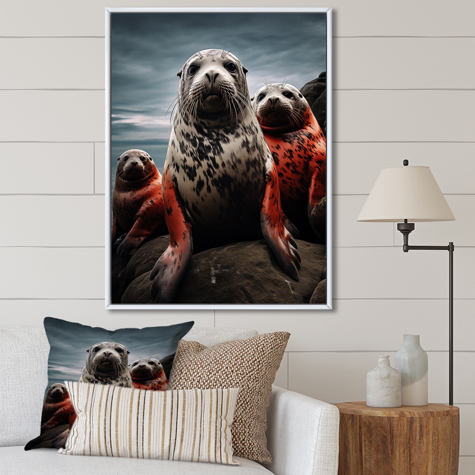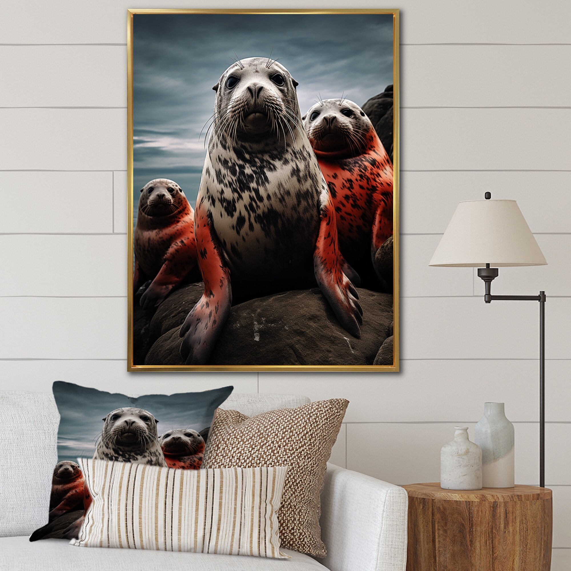 Designart "Grey Red Seal Silent Guardians" Marine Animals Framed Canvas Wall Art