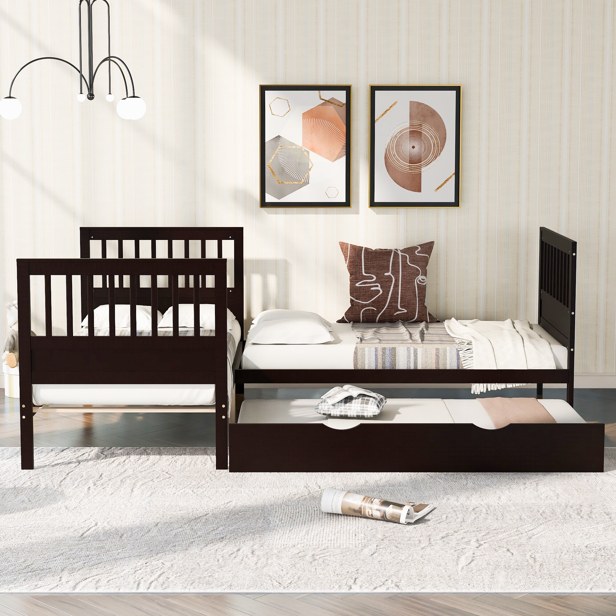 Twin Size Solid Wood Platform Bed with Twin Size Trundle Bed and Slat-Shaped Headboard