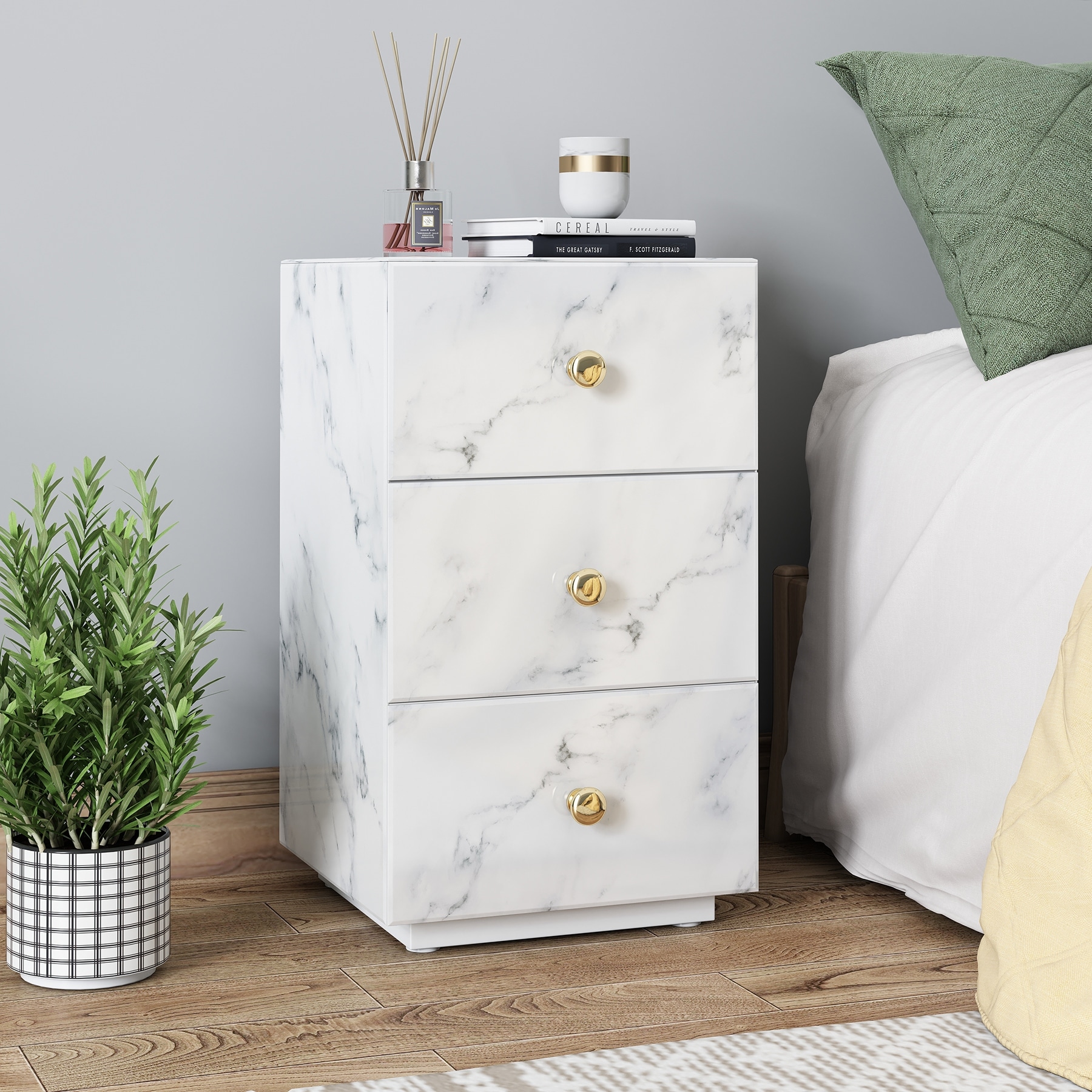 Gray Marble Glass Nightstand - 3 Drawers, Side Table