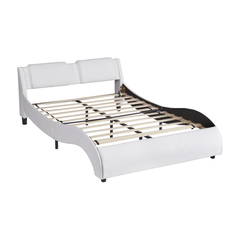 Faux Leather Upholstered Platform Bed with LED Light and Slatted