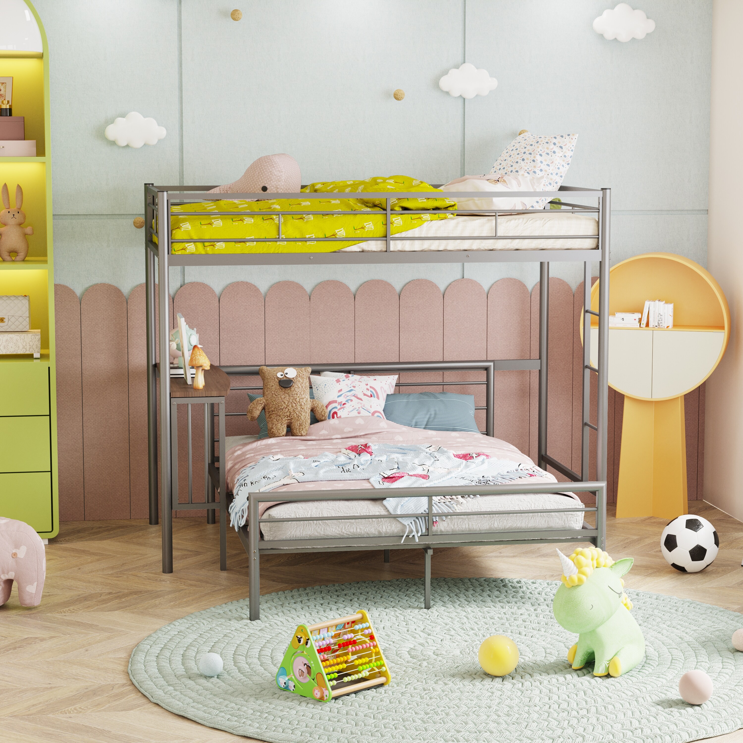 Metallic Silver Twin over Full Metal Bunk Bed with Desk, Ladder and Quality Slats for Bedroom, 78.1''L*41.4''W*65''H, 103LBS