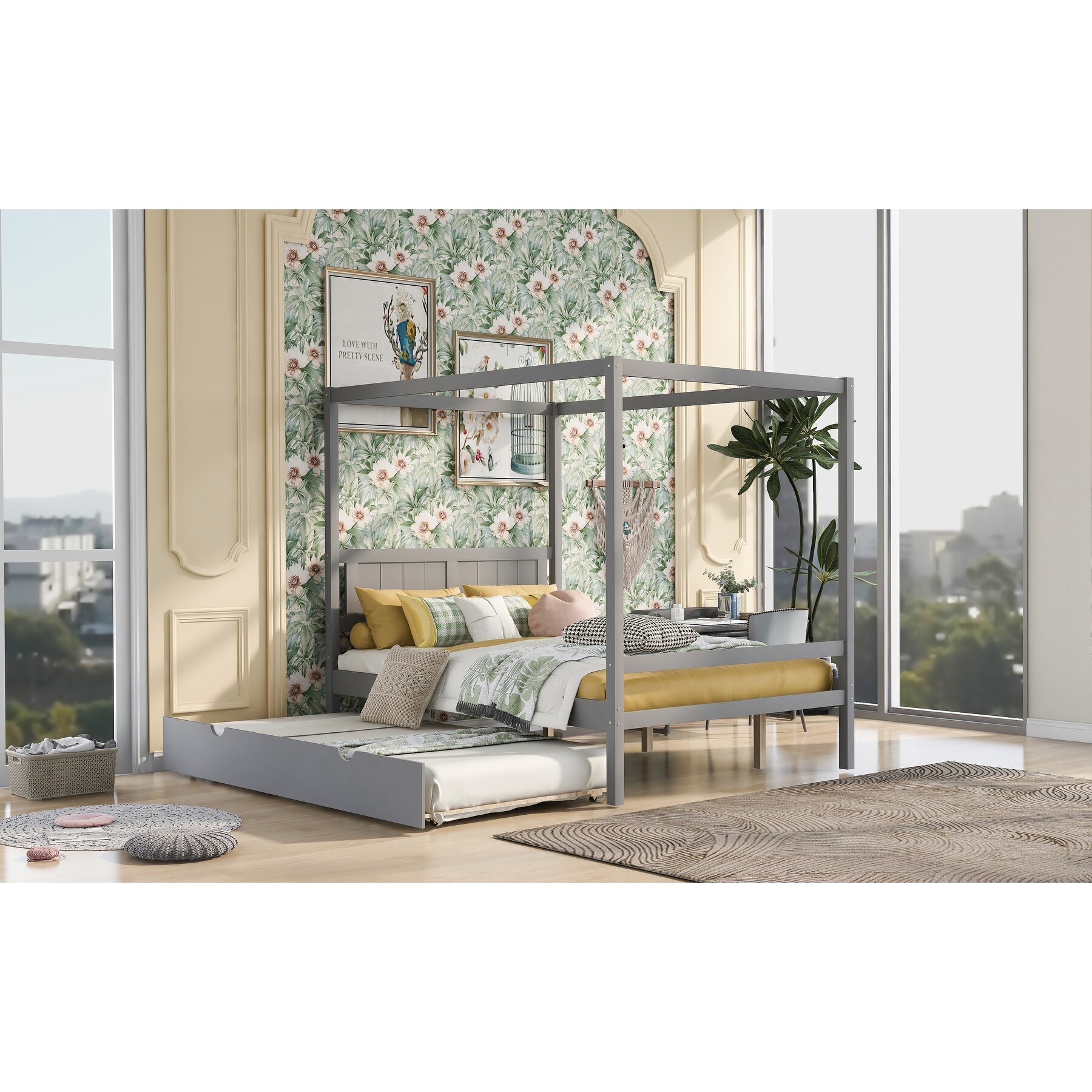 Full Size Canopy Platform Bed with Twin Size Trundle, Solid Wood Slats Support