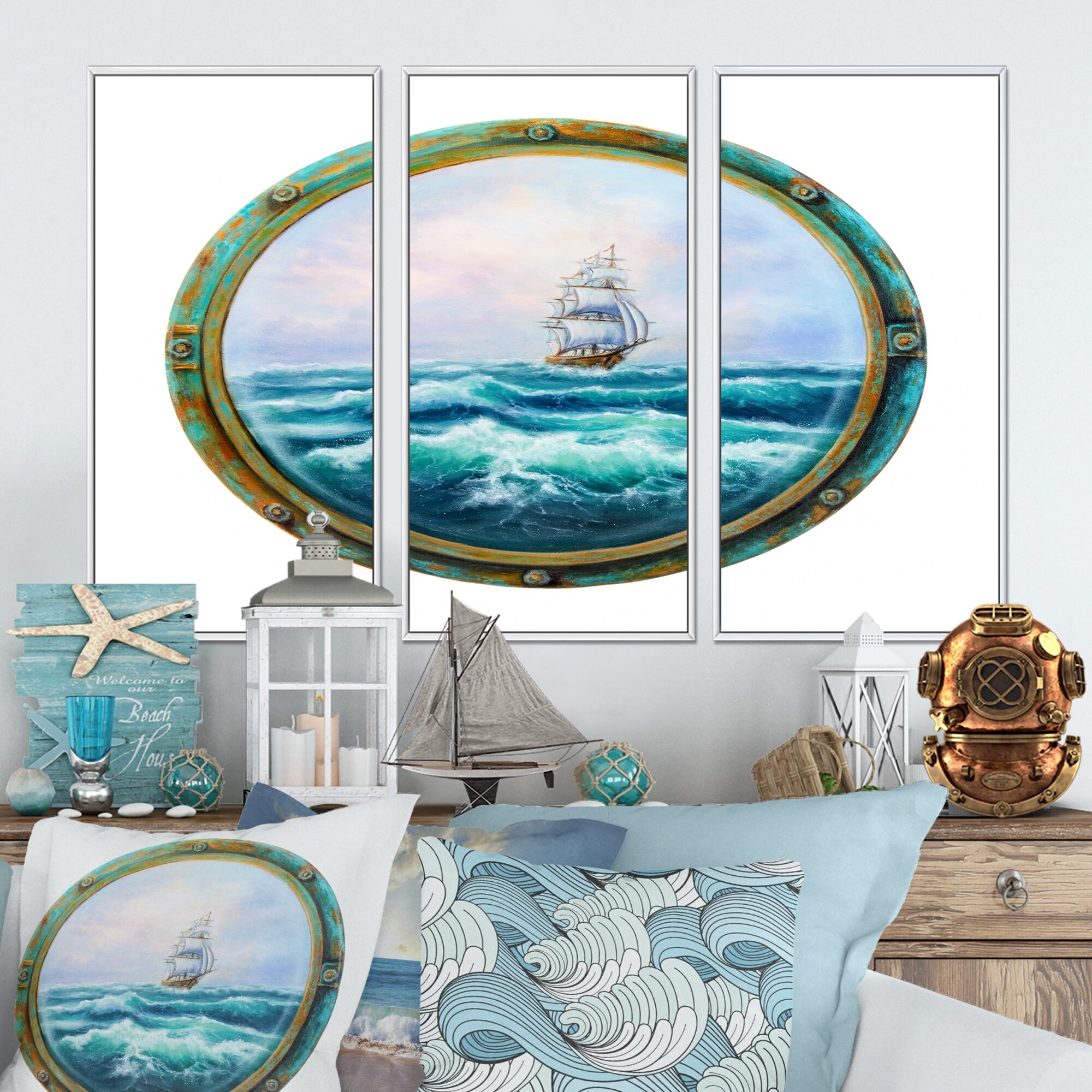 Designart "Cabin Window Showing Ship in Stormy Ocean" Nautical & Coastal Framed Art Set of 3 - 4 Colors of Frames