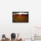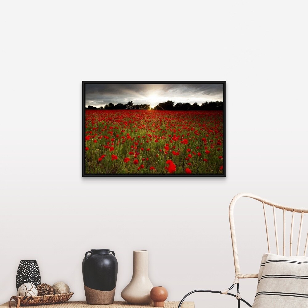 "Sun sets over poppy field, sun showing burst of rays against stormy sky." Black Float Frame Canvas Art