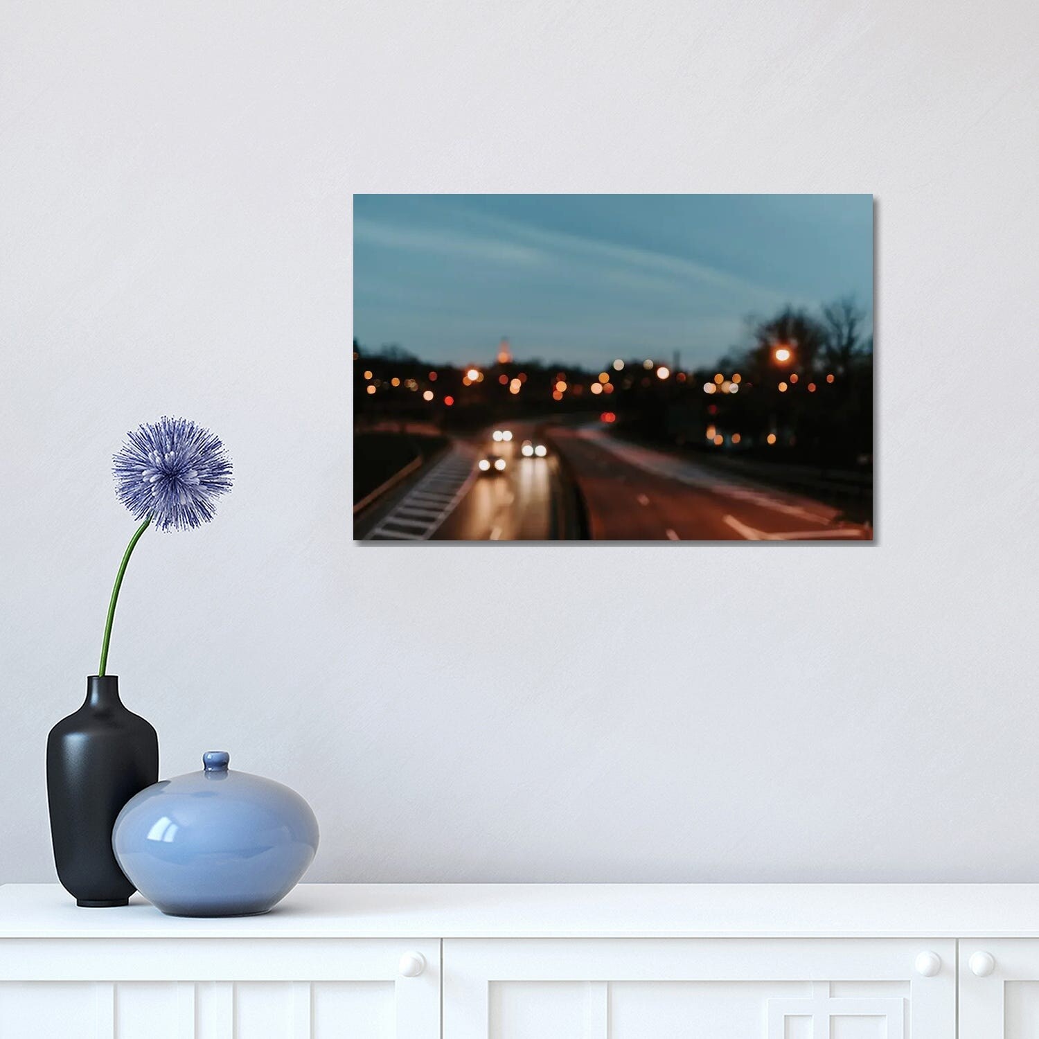 Busy Traffic and City at Night - Cityscape Artwork Print on Canvas - Blue