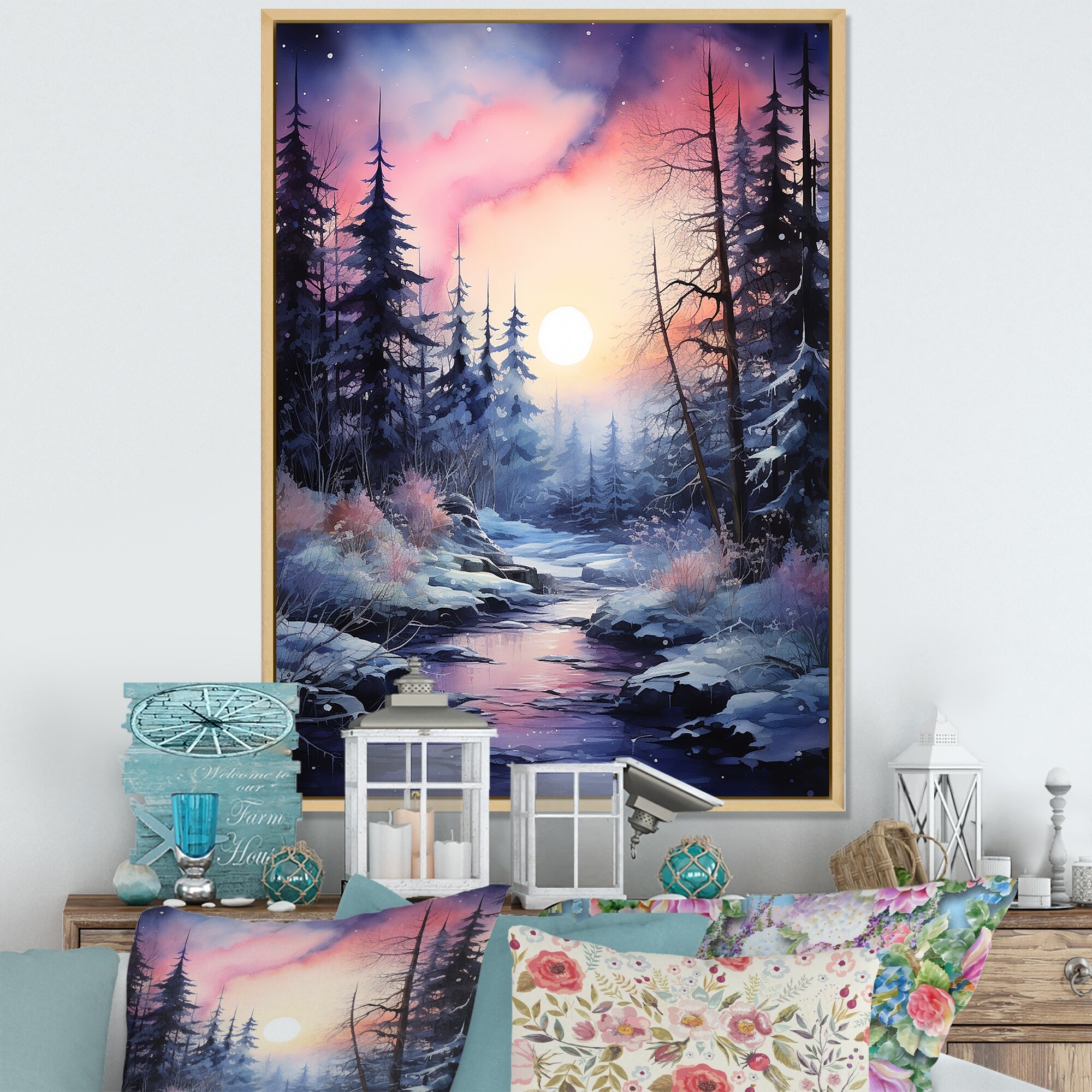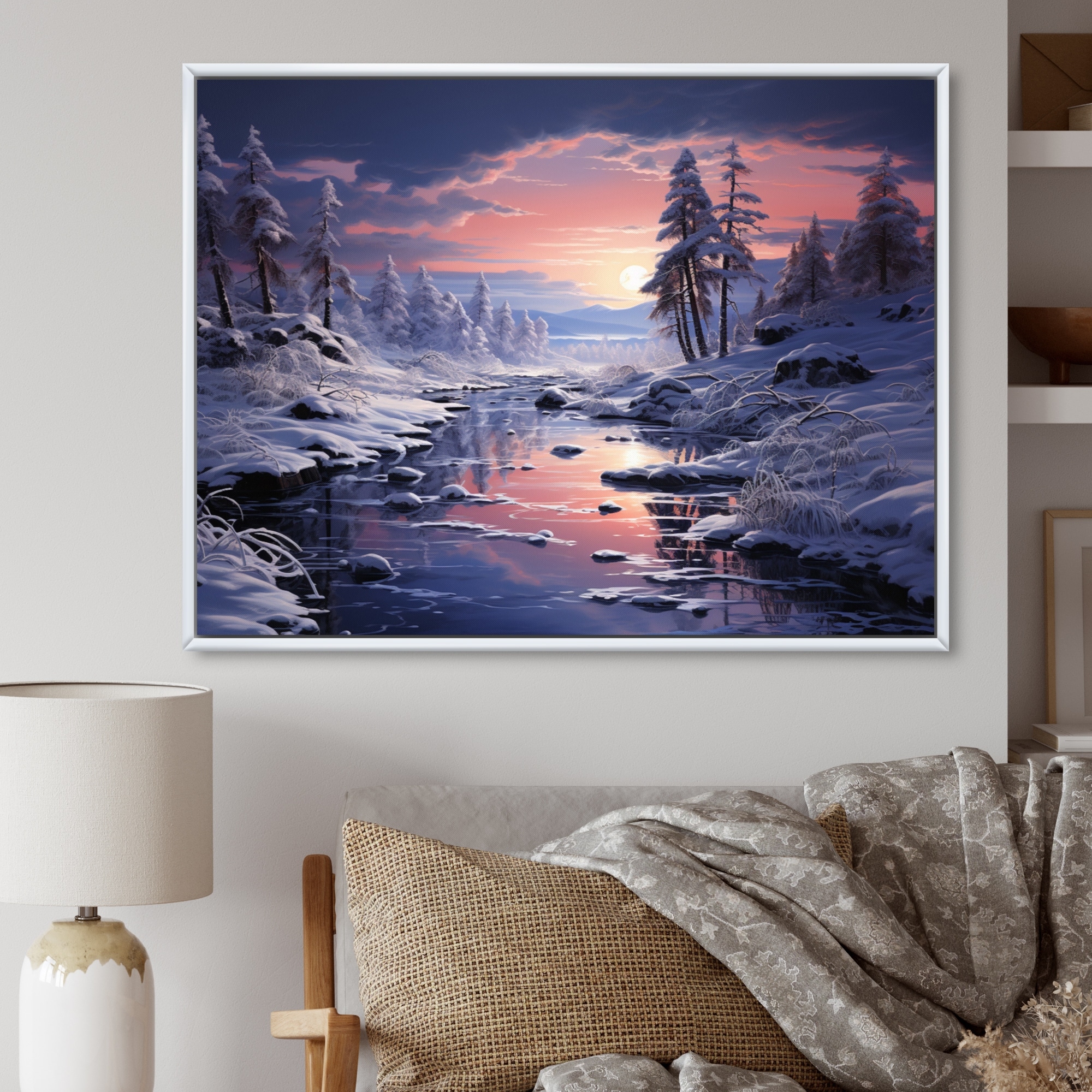 Designart "White Fushia Winter Twilight IV" Winter Landscape Framed Wall Art Prints