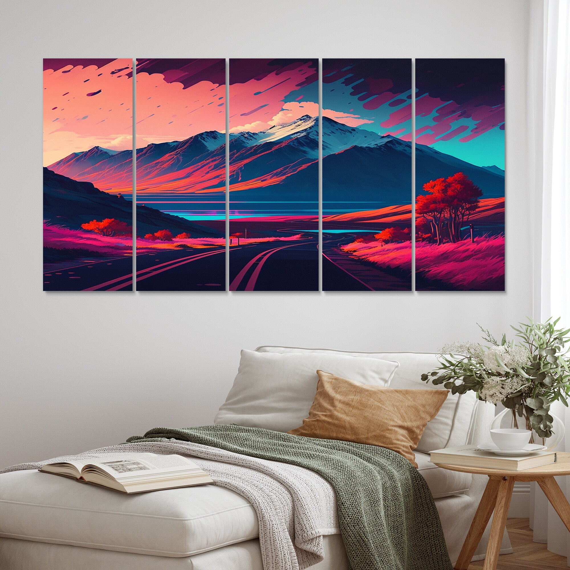 Designart "Magenta Autumn Morning Road II" Landscape Mountains Multipanel Wall Art Living Room