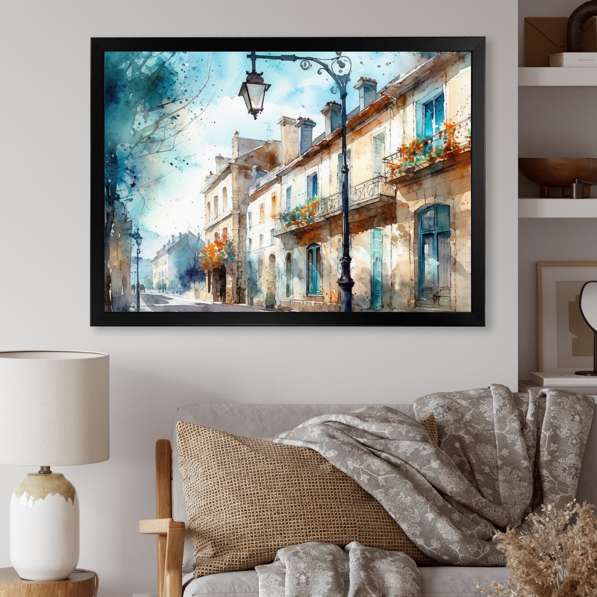 Designart "Blue And Beige French Small Town" City Art Deco Framed Wall Art for Living Room
