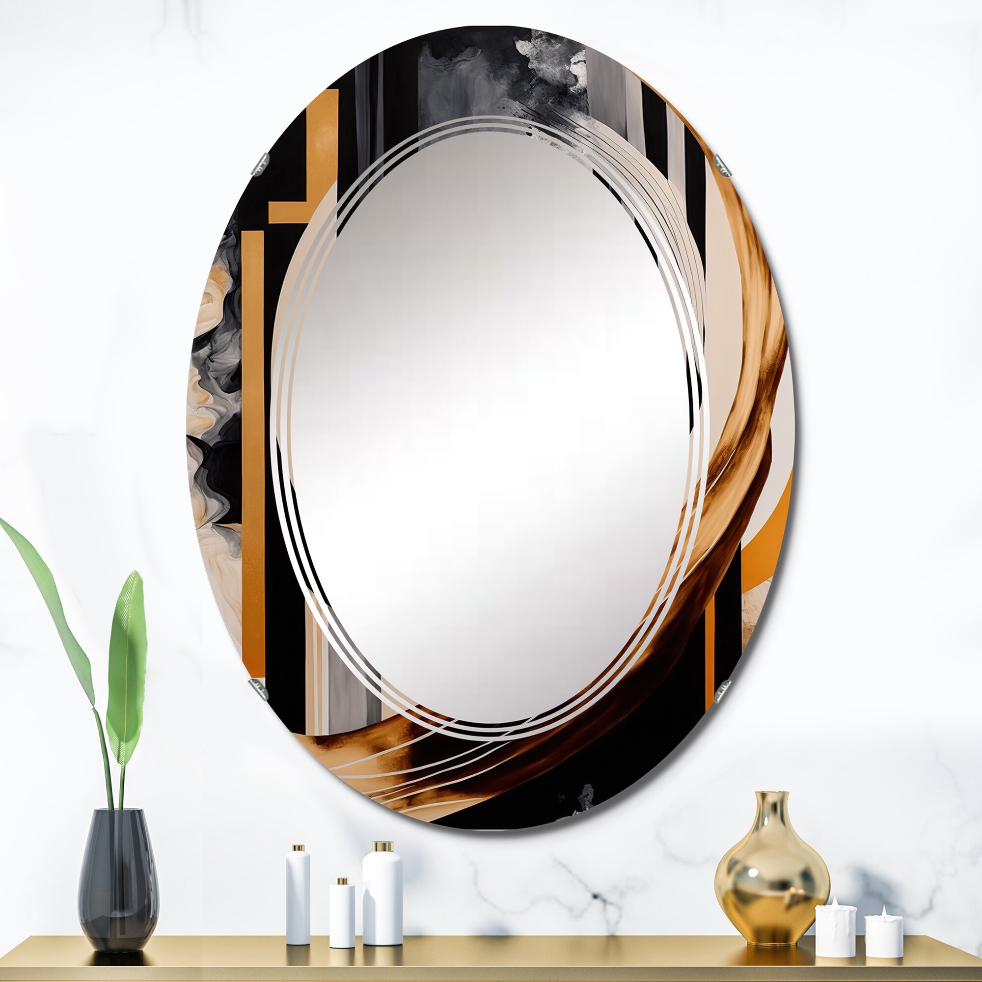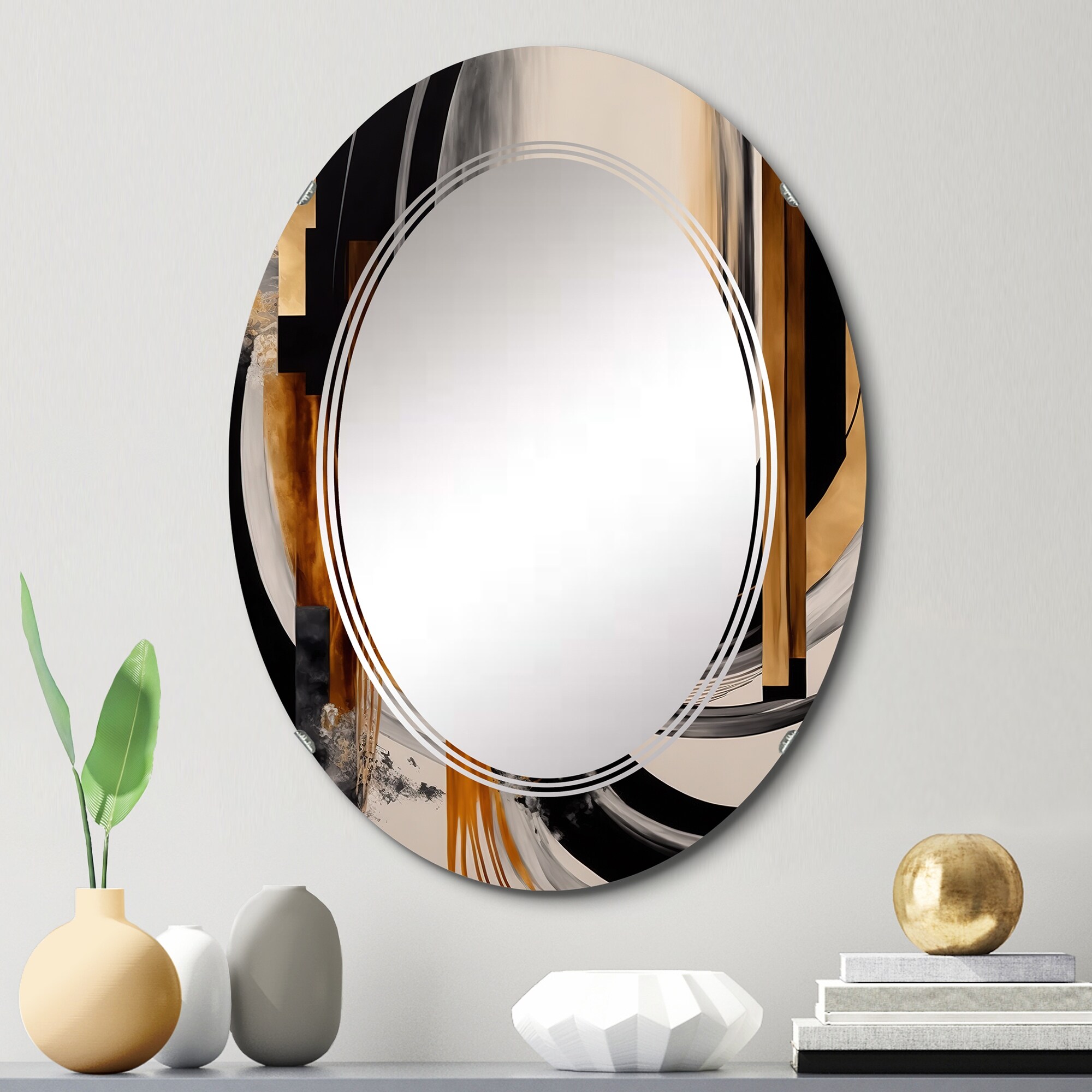 Designart 'Retro Art Deco Waves I' Printed Modern Round or Oval Wall Mirror - Leaves