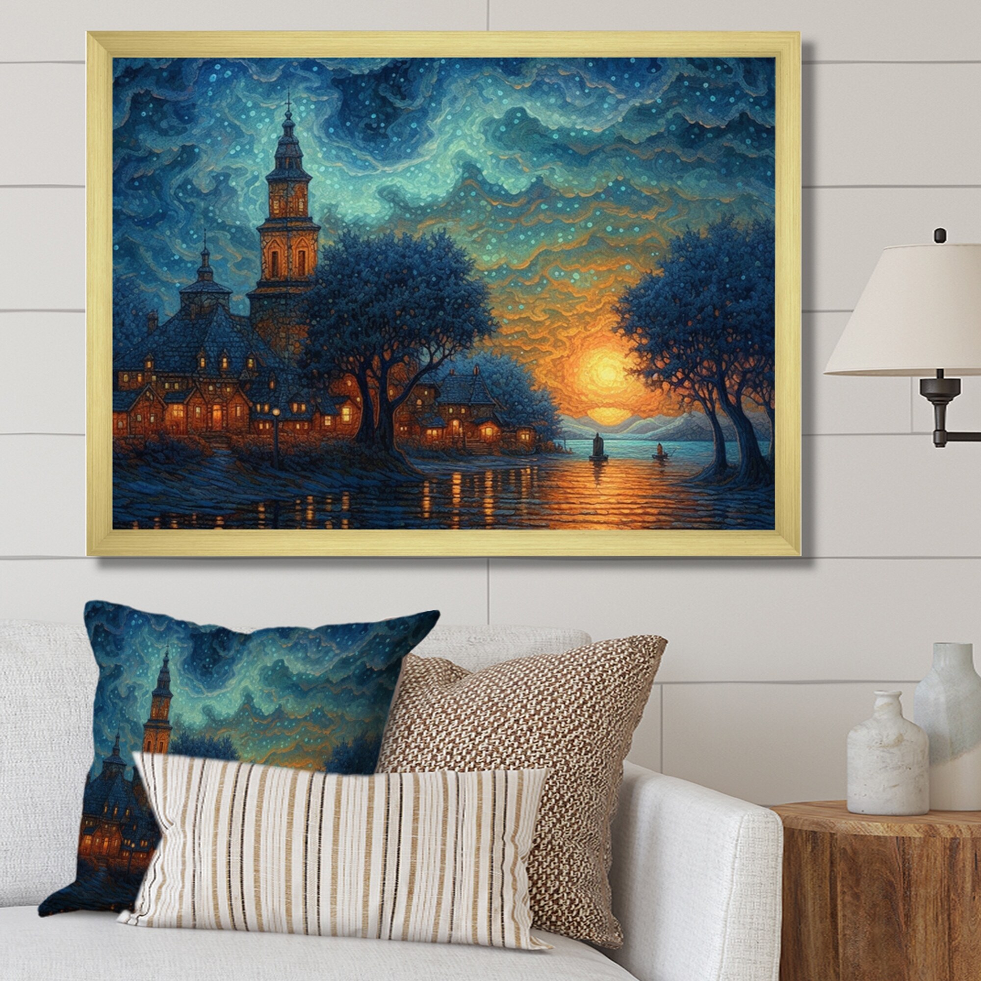 Designart "Blue And Yellow Drama of a Stormy Night City Ii" City Art Deco Framed Canvas Wall Art