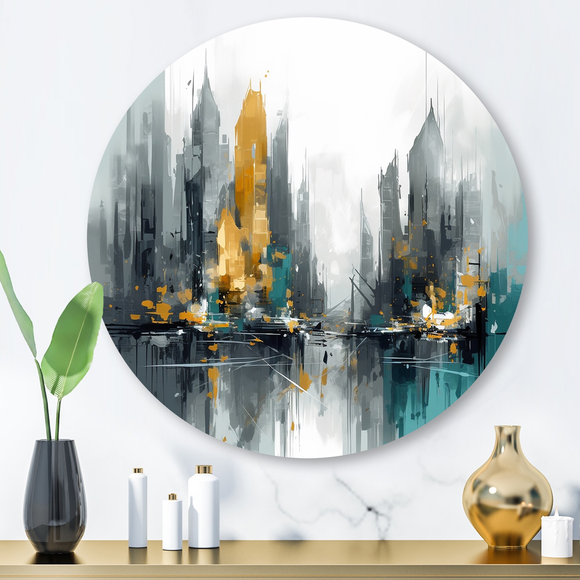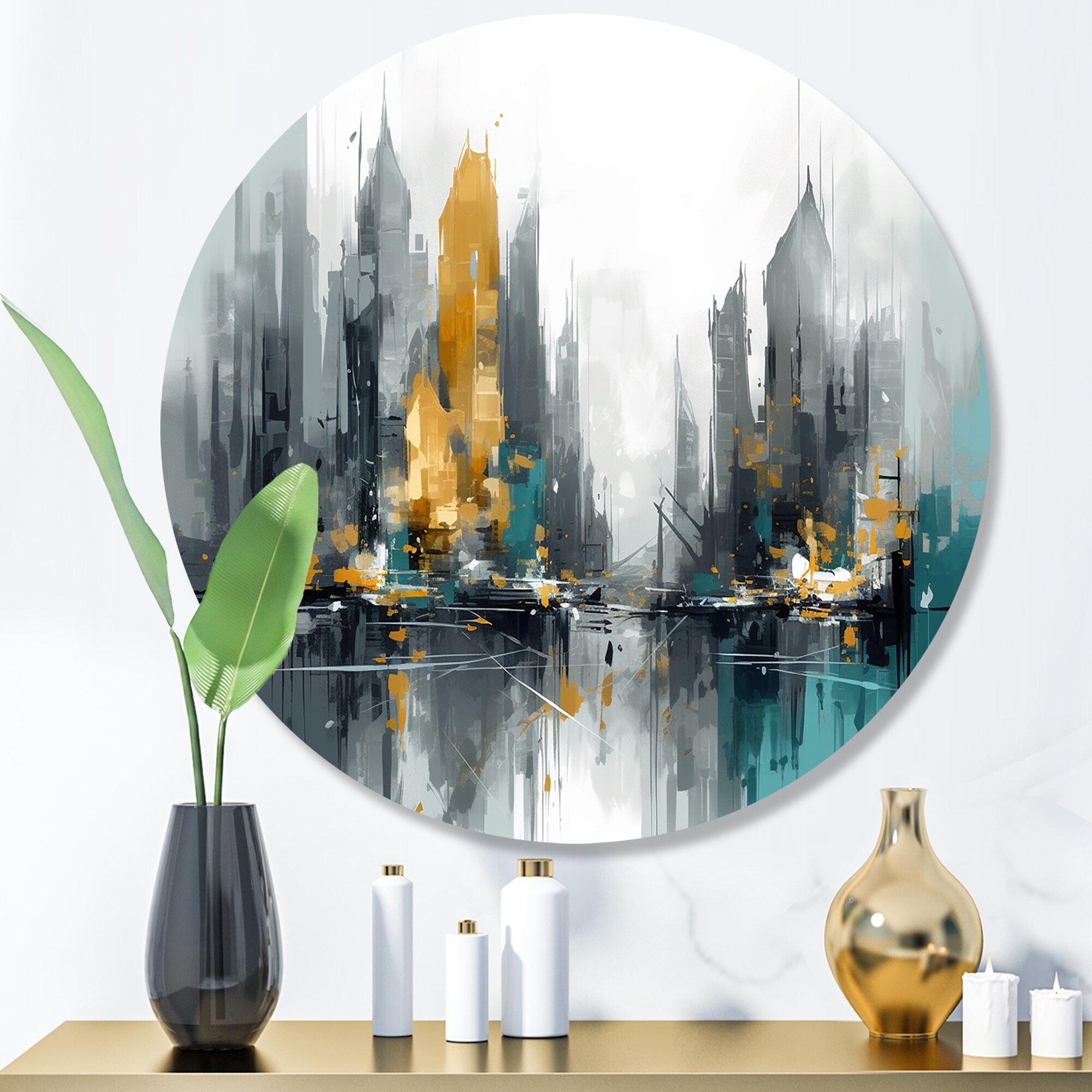 Designart "Green And Yellow Modernist Cityscapes I" City Art Deco Metal Round Wall Art