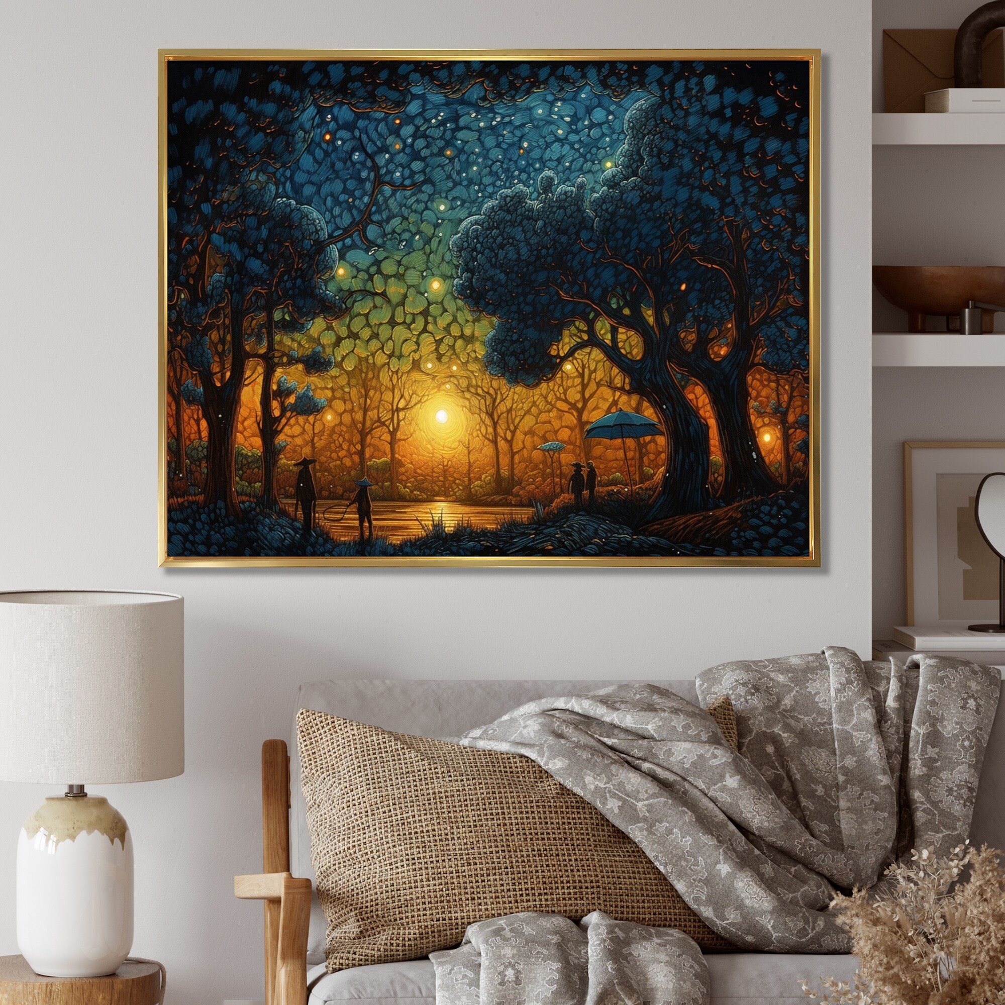 Designart "Orange And Blue Electrifying Skylines" City Art Deco Framed Wall Art for Living Room