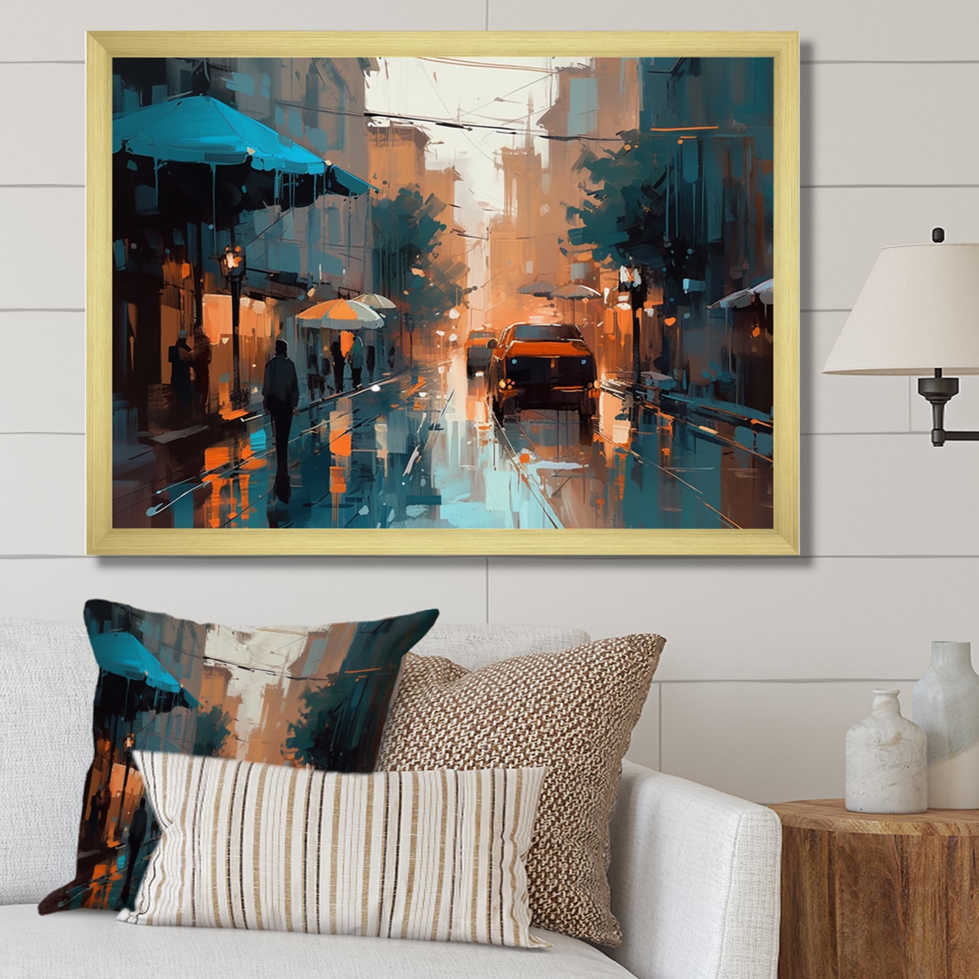 Designart "Blue And Orange Capturing the Beauty of a Rainy Day I" City Art Deco Framed Wall Art Prints