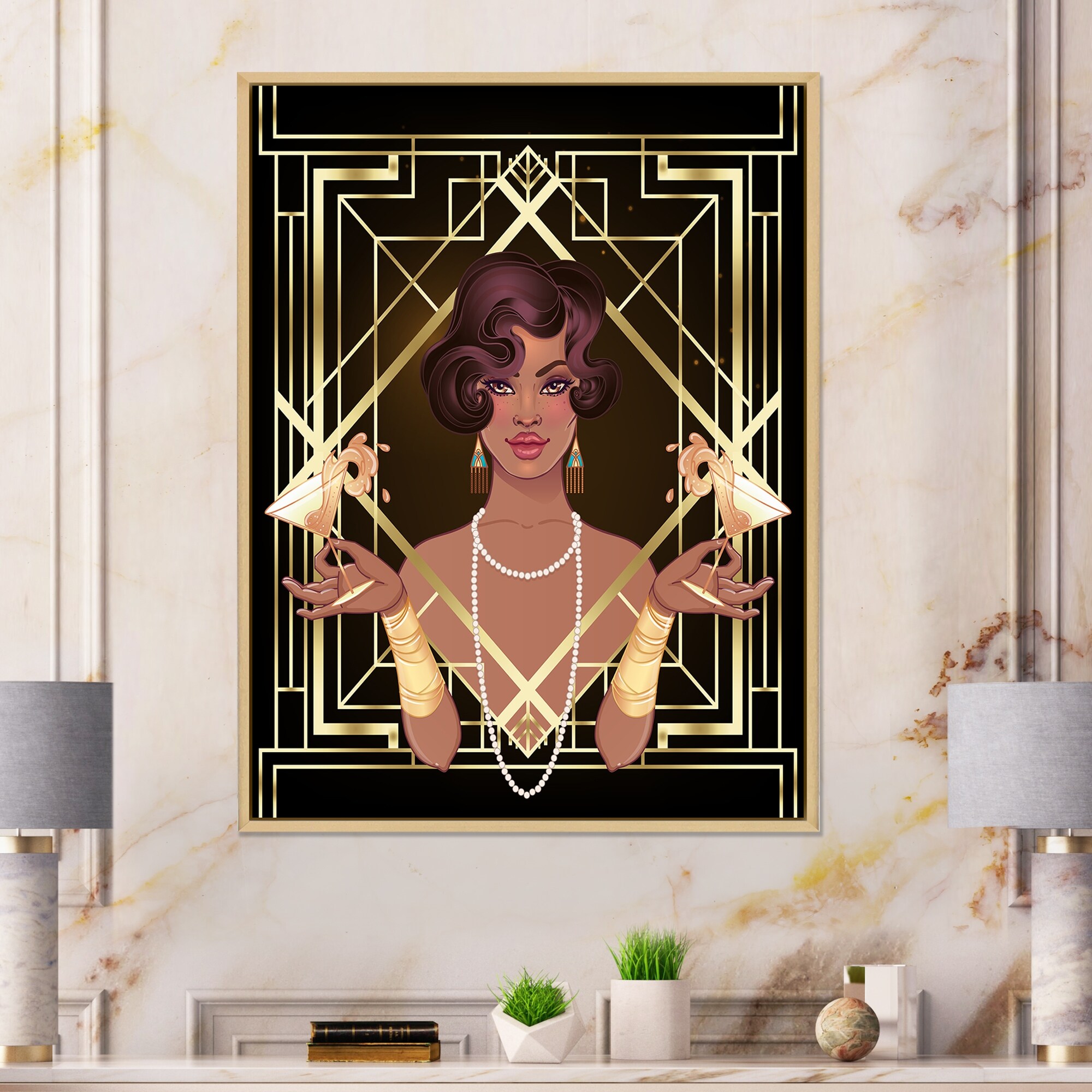 Designart "Retro Women in Golden Art Deco Geometrics I" Modern Framed Canvas Wall Art Print