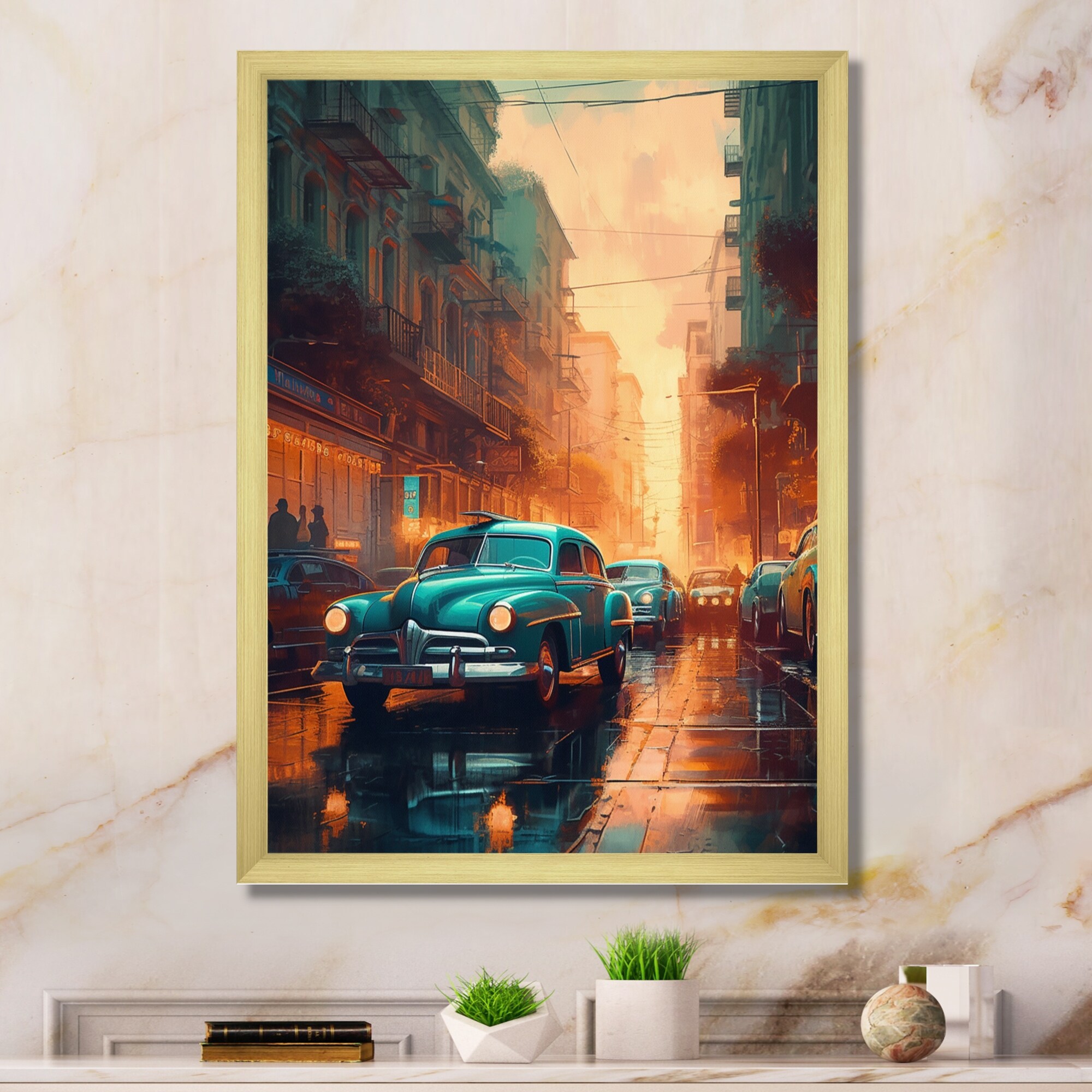 Designart "Orange And Green Nostalgic Visions" City Art Deco Framed Canvas Wall Art