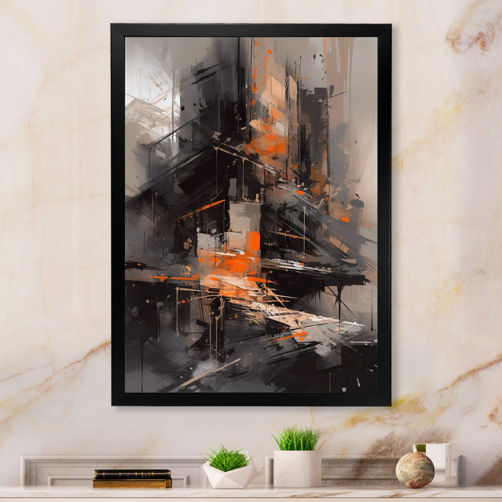 Designart "Black And Orange Architectural Tapestry" City Art Deco Framed Canvas Wall Art