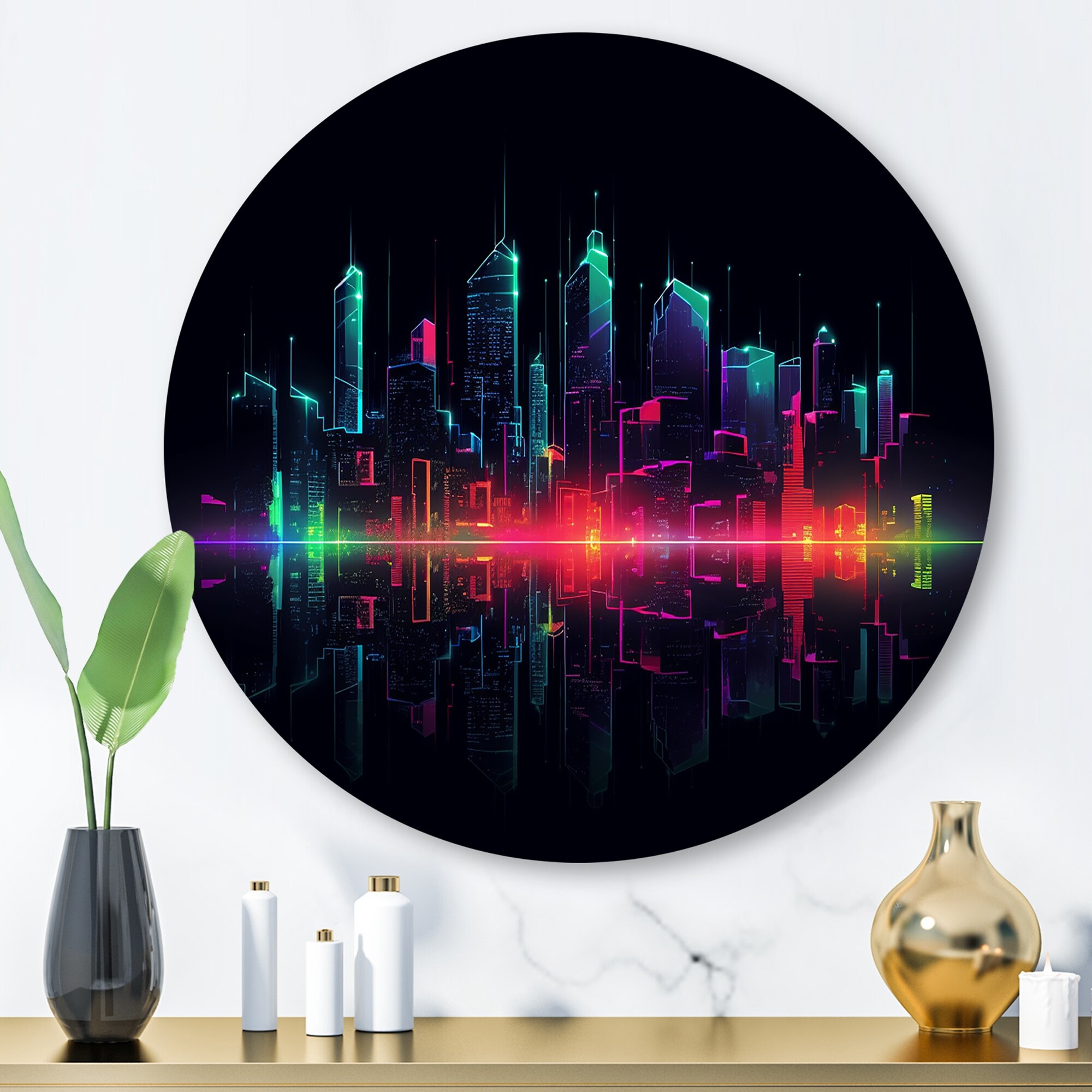 Designart "Pink And Green Cityscapes in Vivid Expression I" City Art Deco Metal Round Wall Art