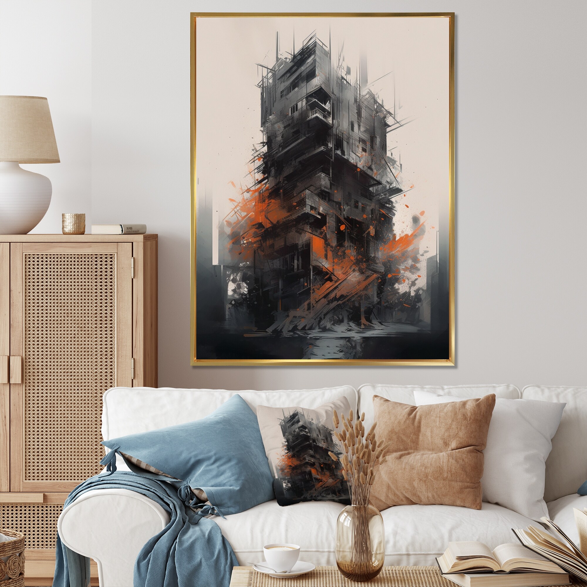Designart "Grey And Orange Architectural Tapestry" City Art Deco Framed Canvas Wall Art