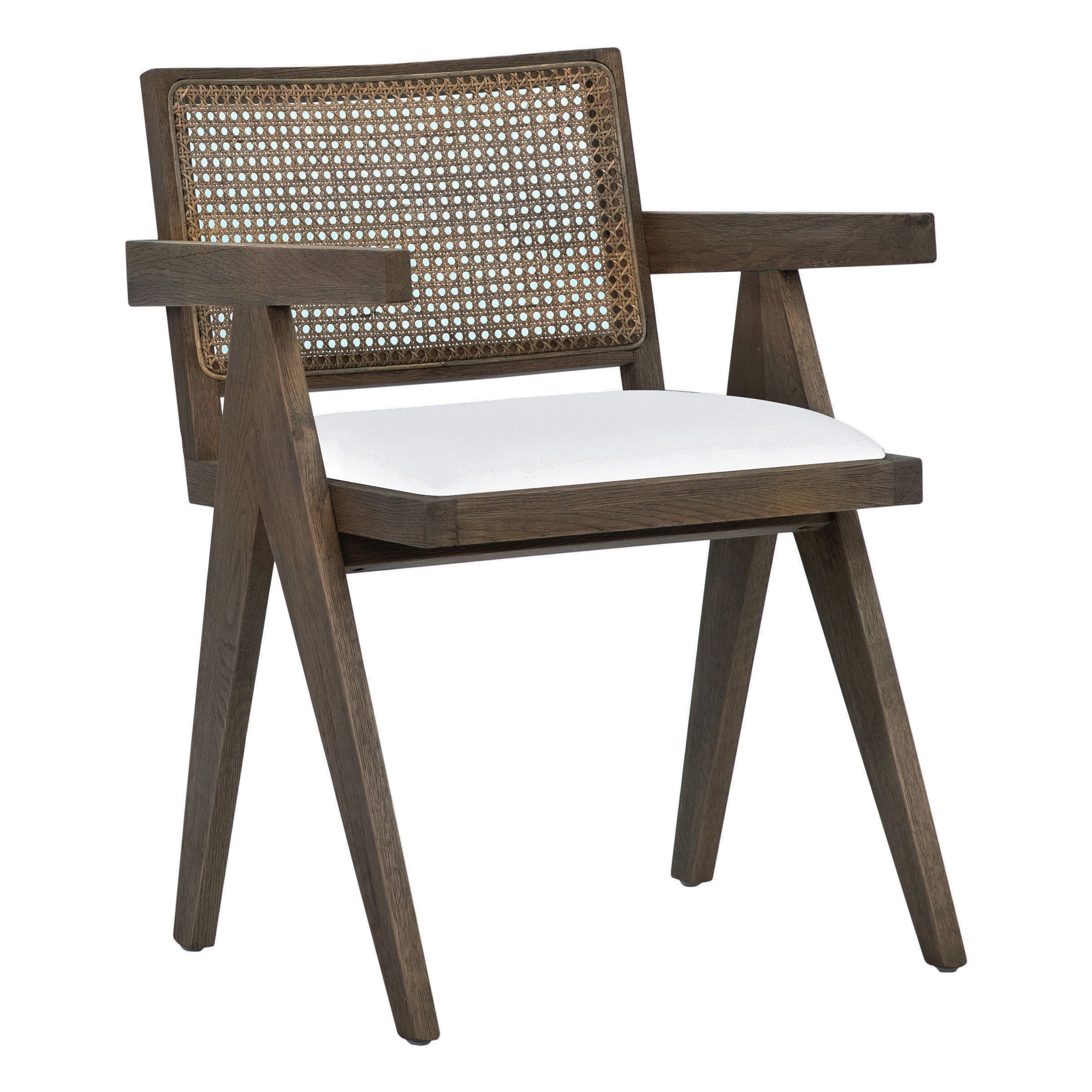 Malachi Dining Armchair with White Linen Upholstered Seat, Grey Wash Oak and Natural Rattan