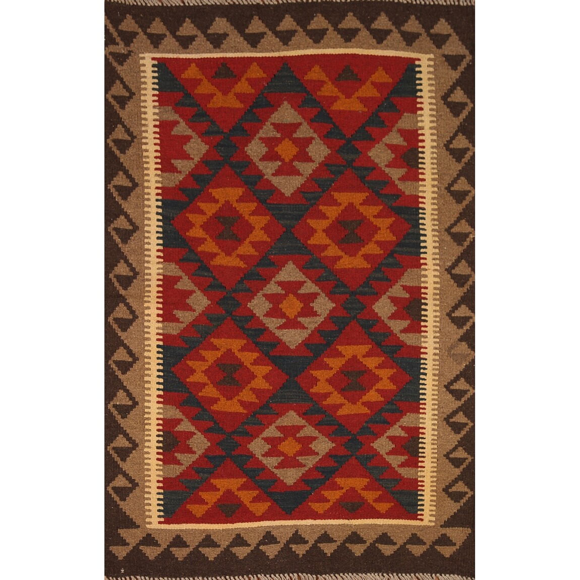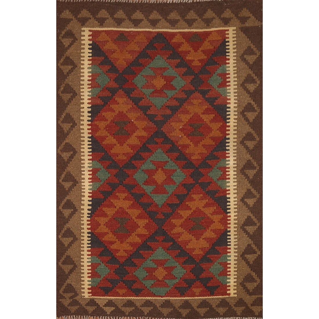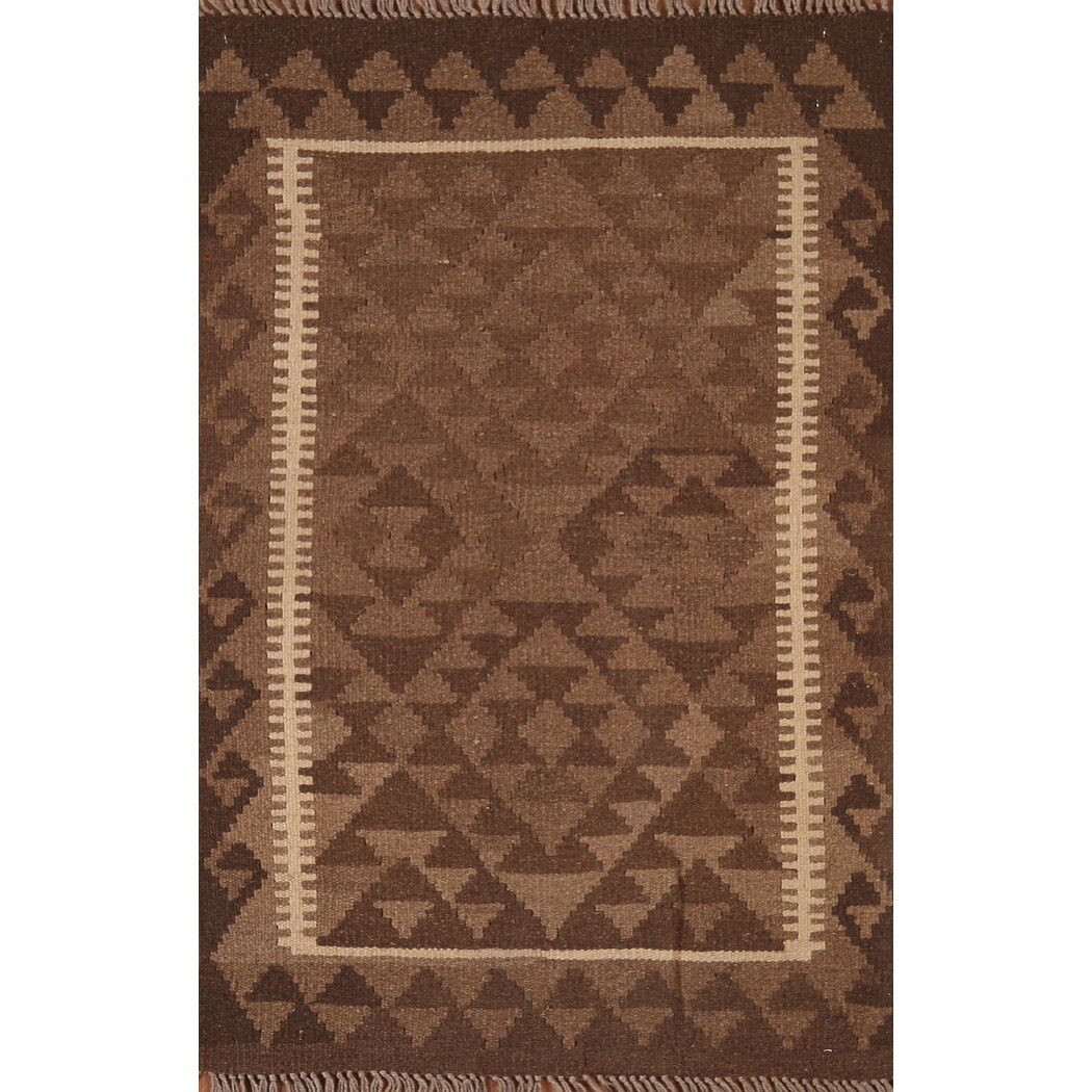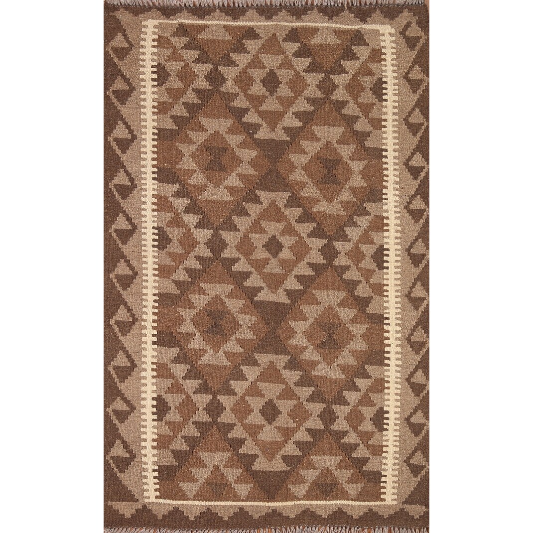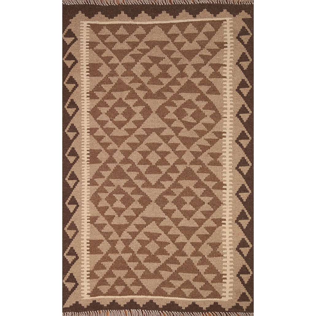 Brown Kilim Geometric Area Rug Reversible Flat-weave Wool Carpet - 3'2" x 5'0"