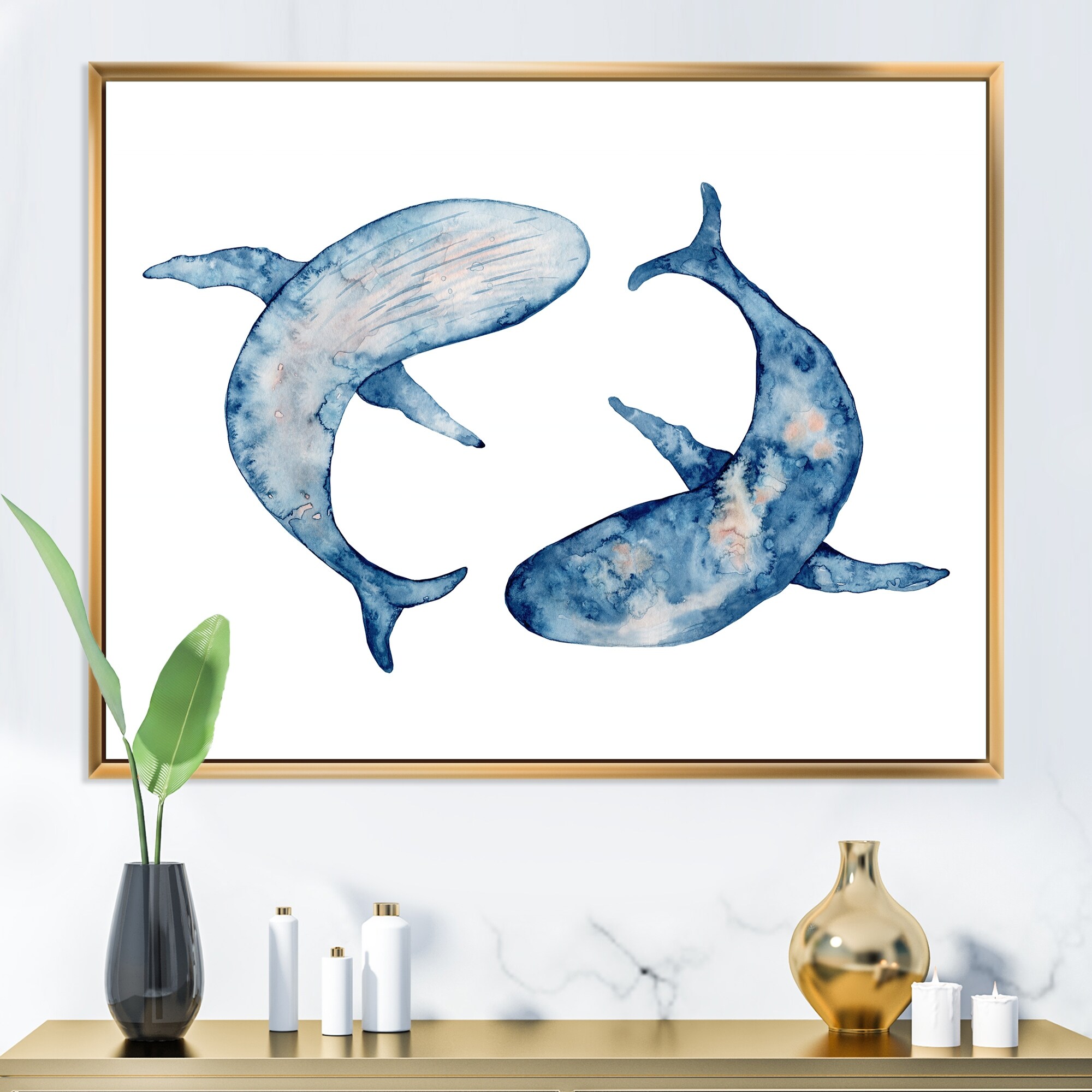 Designart "Blue Whales Watercolor Illustration on White" Nautical & Coastal Framed Canvas Wall Art Print