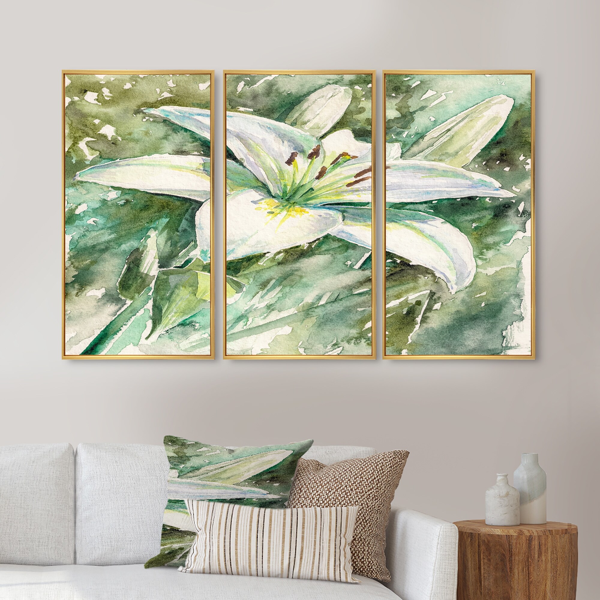 Designart "Large White Lily Painting" Floral Framed Canvas Wall Art Set of 3 - 4 Colors of Frames