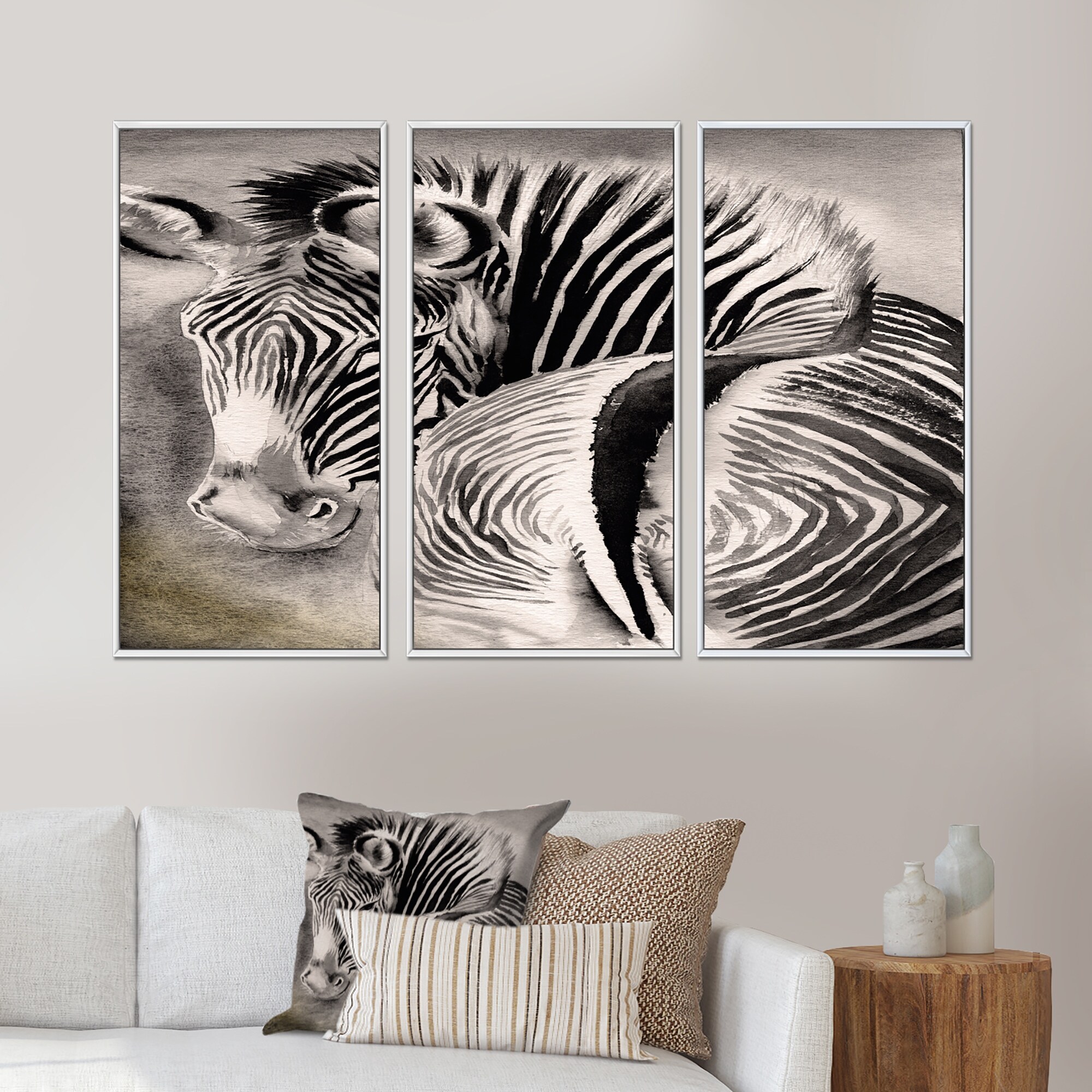 Designart "Zebra With Contrasting Black And White Stripes IV" Traditional Framed Artwork Set of 3 - 4 Colors of Frames