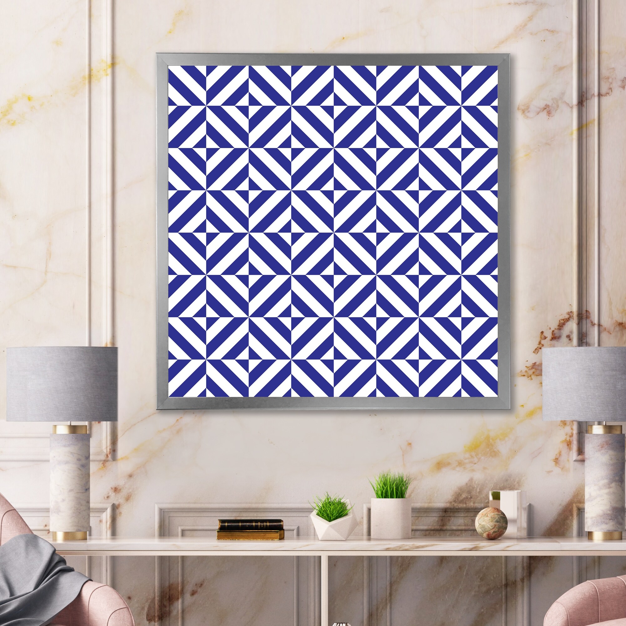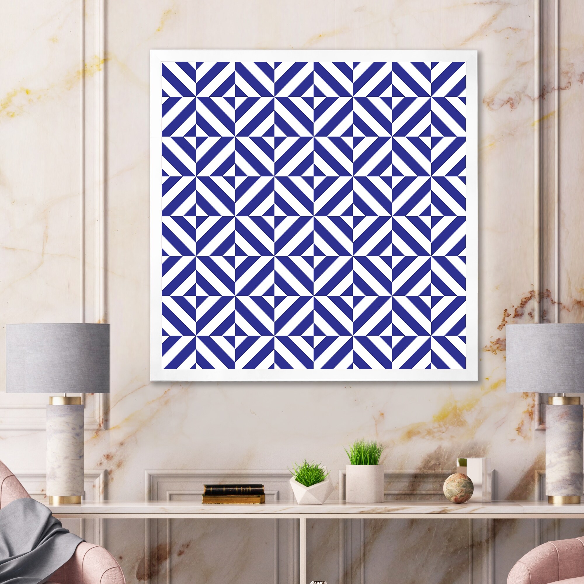 Designart "Blue And White Striped Geometrics" Patterned Framed Art Print