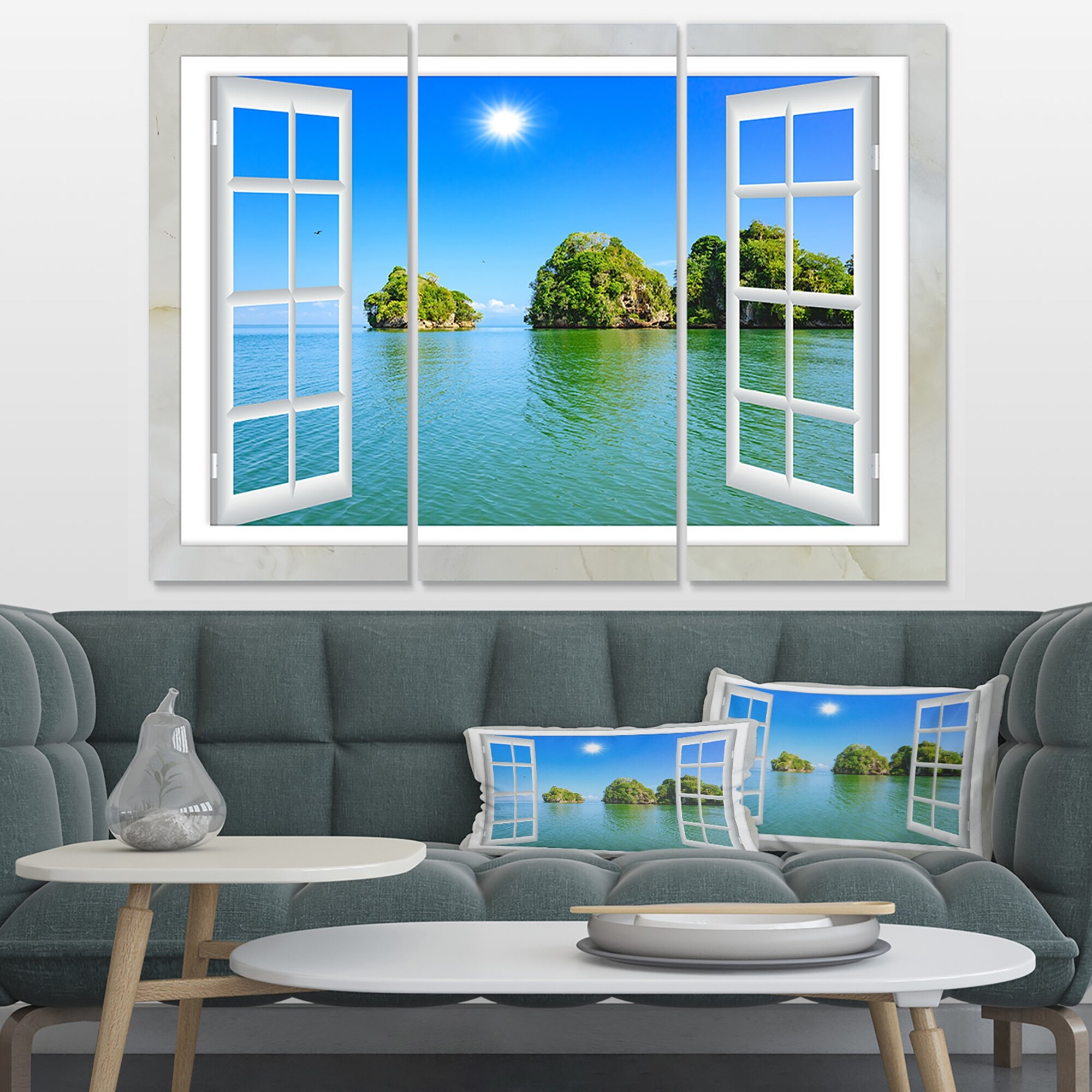 Designart "Open Window to Ocean Islets" Oversized Landscape Wall Art Print - 36x28 - 3 Panels