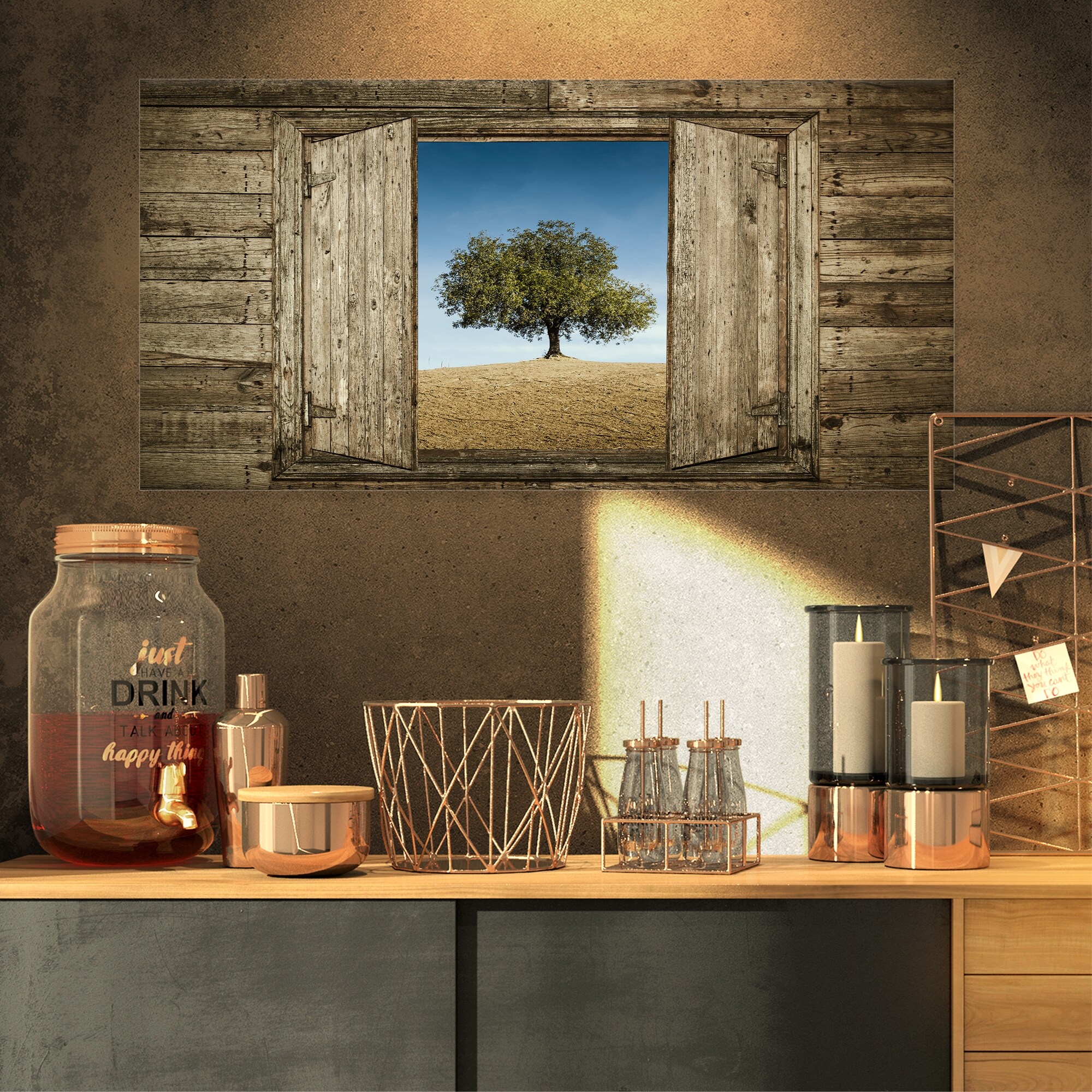 Designart 'Window Open to Solitary Tree' Farmhouse Print on Natural Pine Wood - Brown
