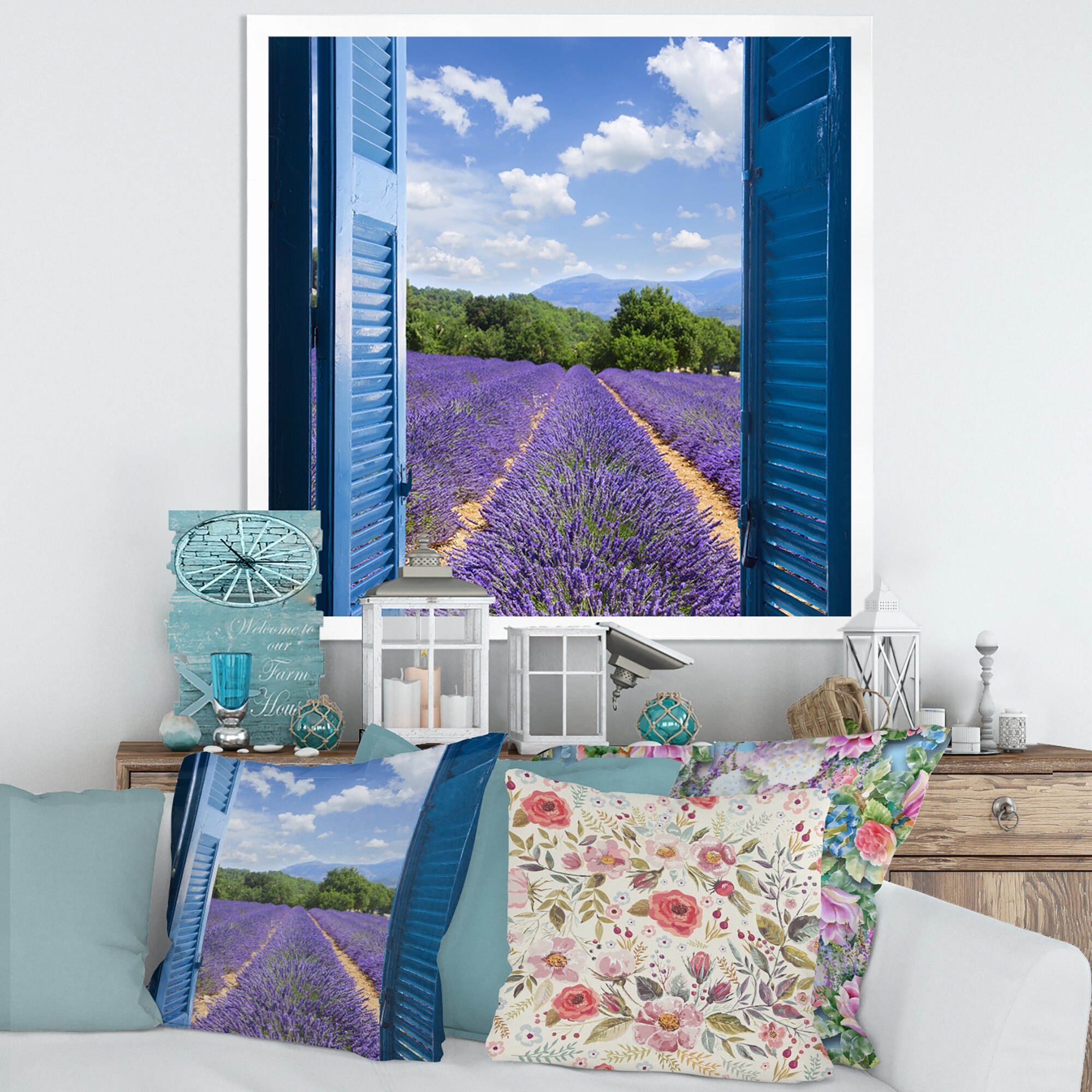 Designart "Lavender Field Through Blue Open Cottage Window" Farmhouse Canvas Wall Art Print