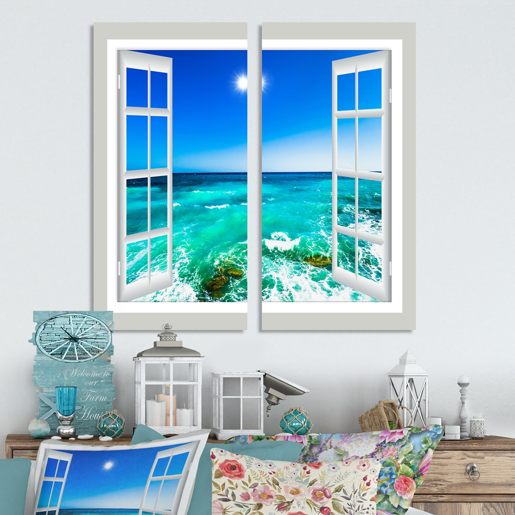 Designart "Open Window to Wavy Ocean" Seashore Canvas Wall Art Print 2 Piece Set