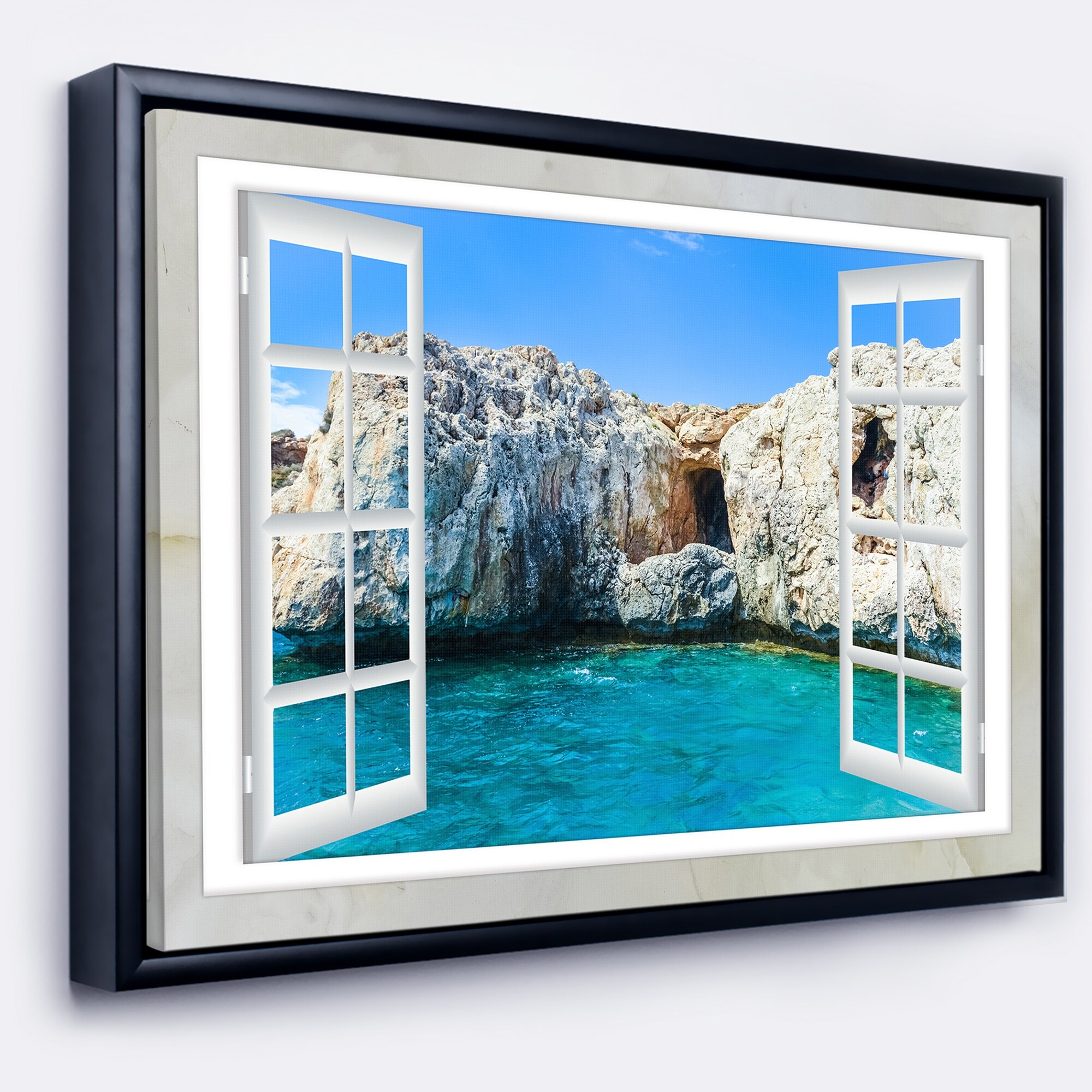 Designart "Open Window to Blue Seashore" Landscape Framed Canvas Art