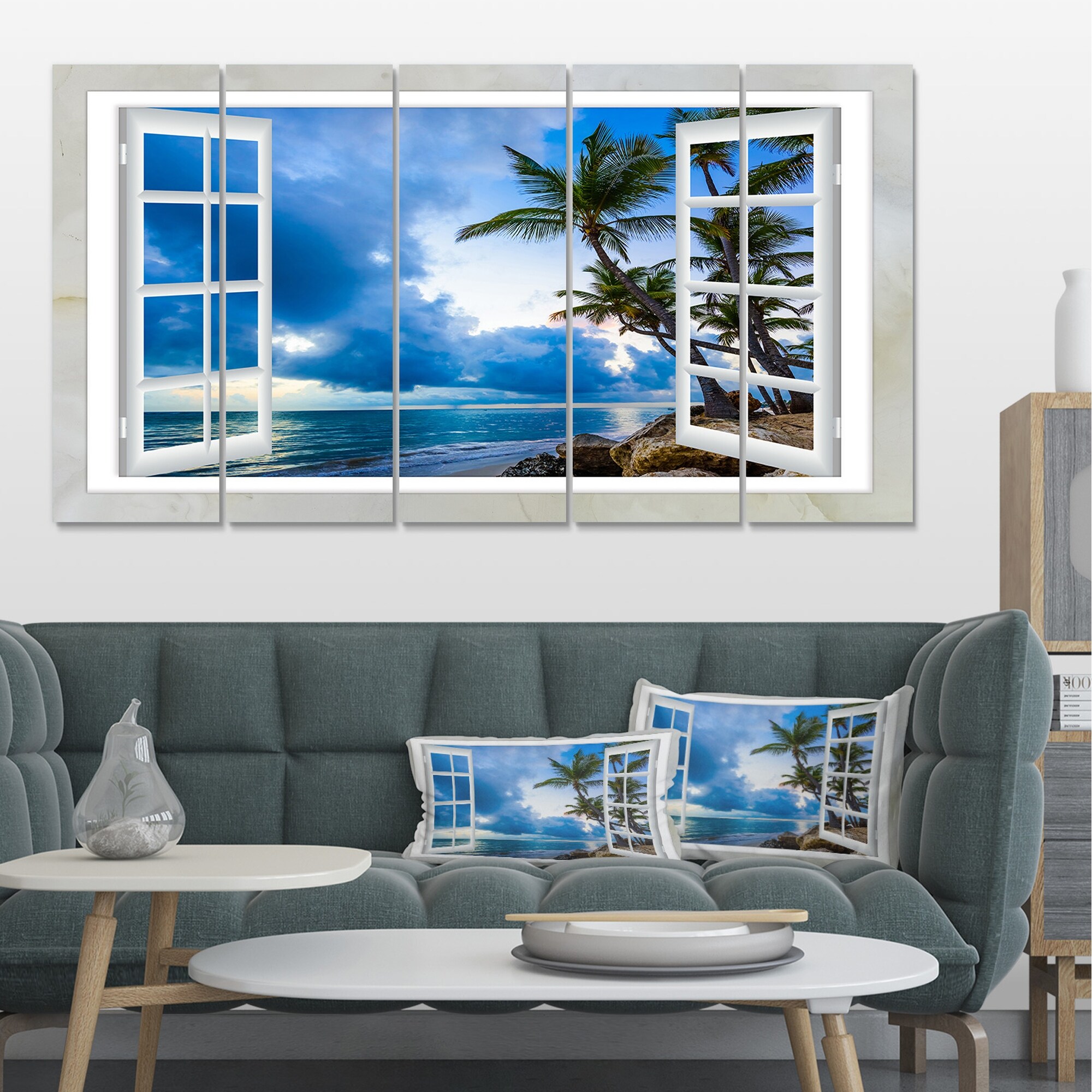 Designart "Open Window to Beach with Palm" Seashore Canvas Wall Art Print 2 Piece Set